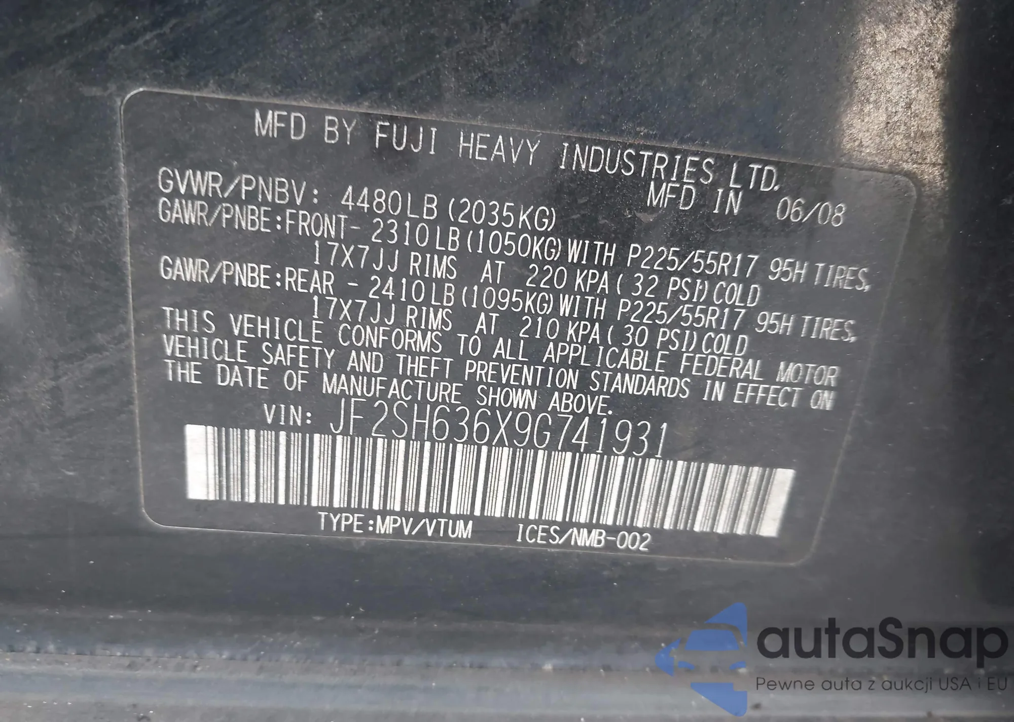 • VIN JF2SH636X9G741931