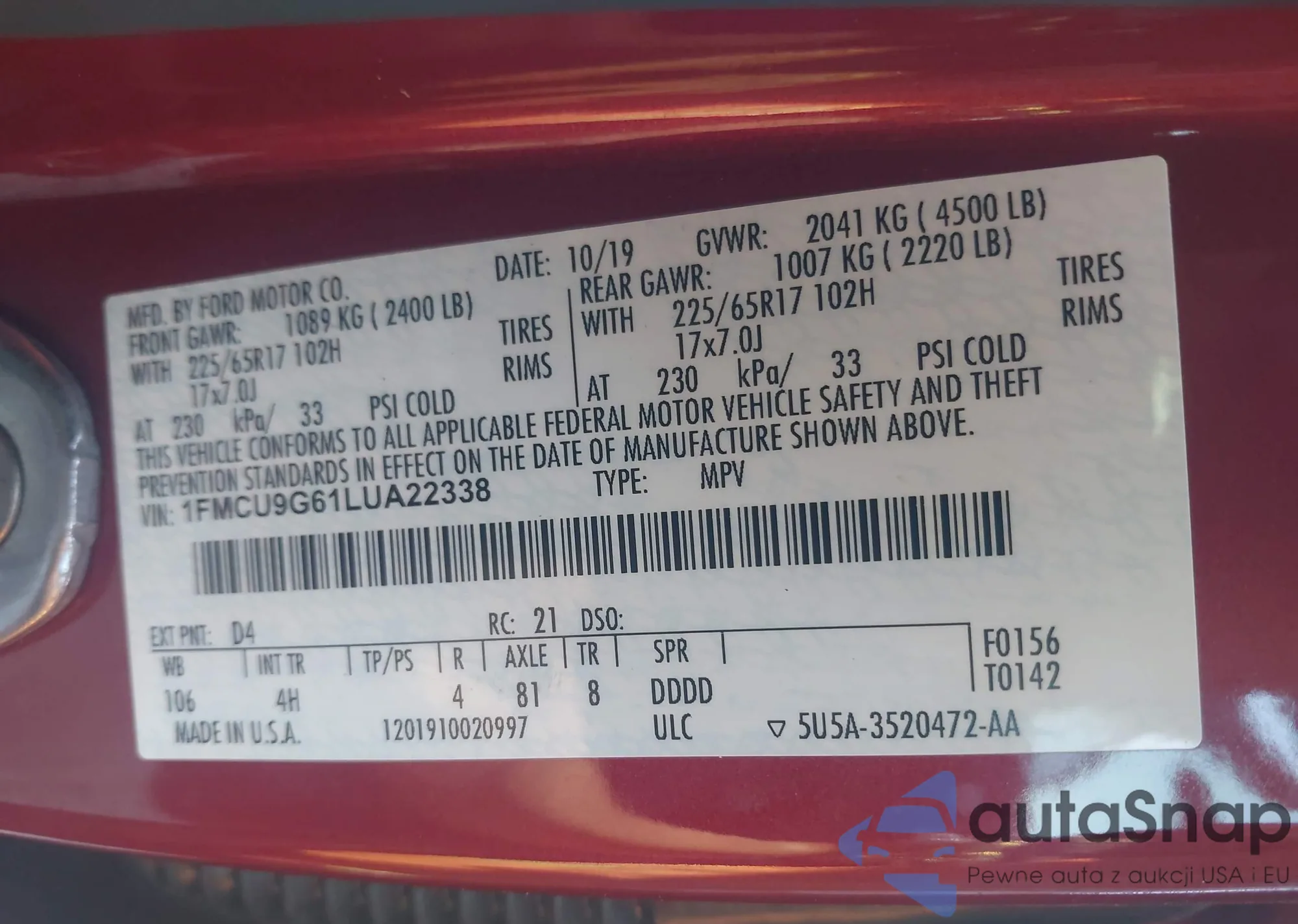 LOT: 42712509 VIN: 1FMCU9G61LUA22338