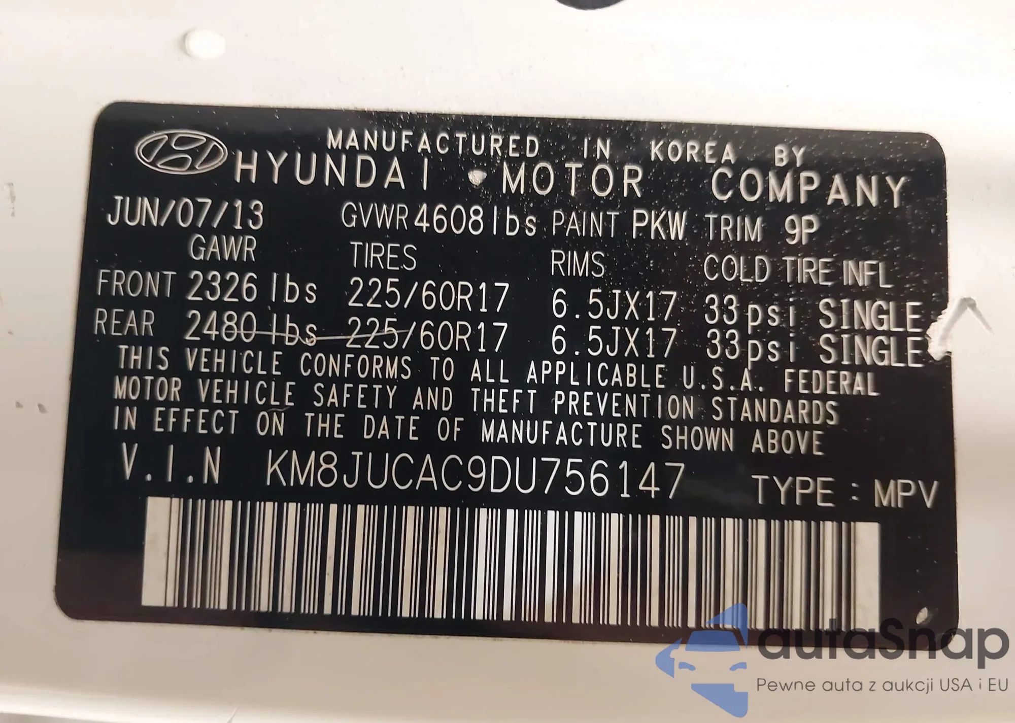• VIN KM8JUCAC9DU756147