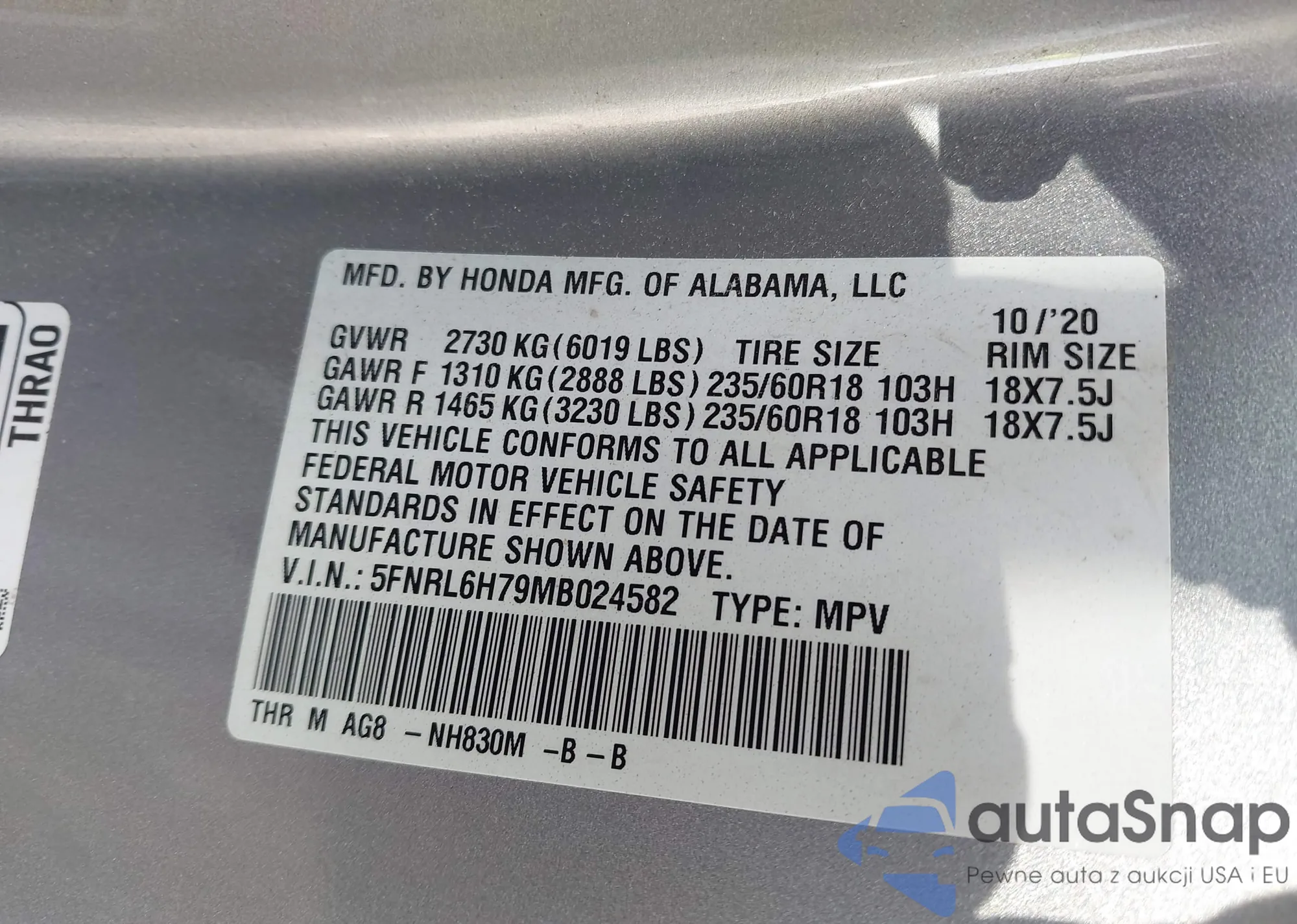 • VIN 5FNYF5H96HB043319