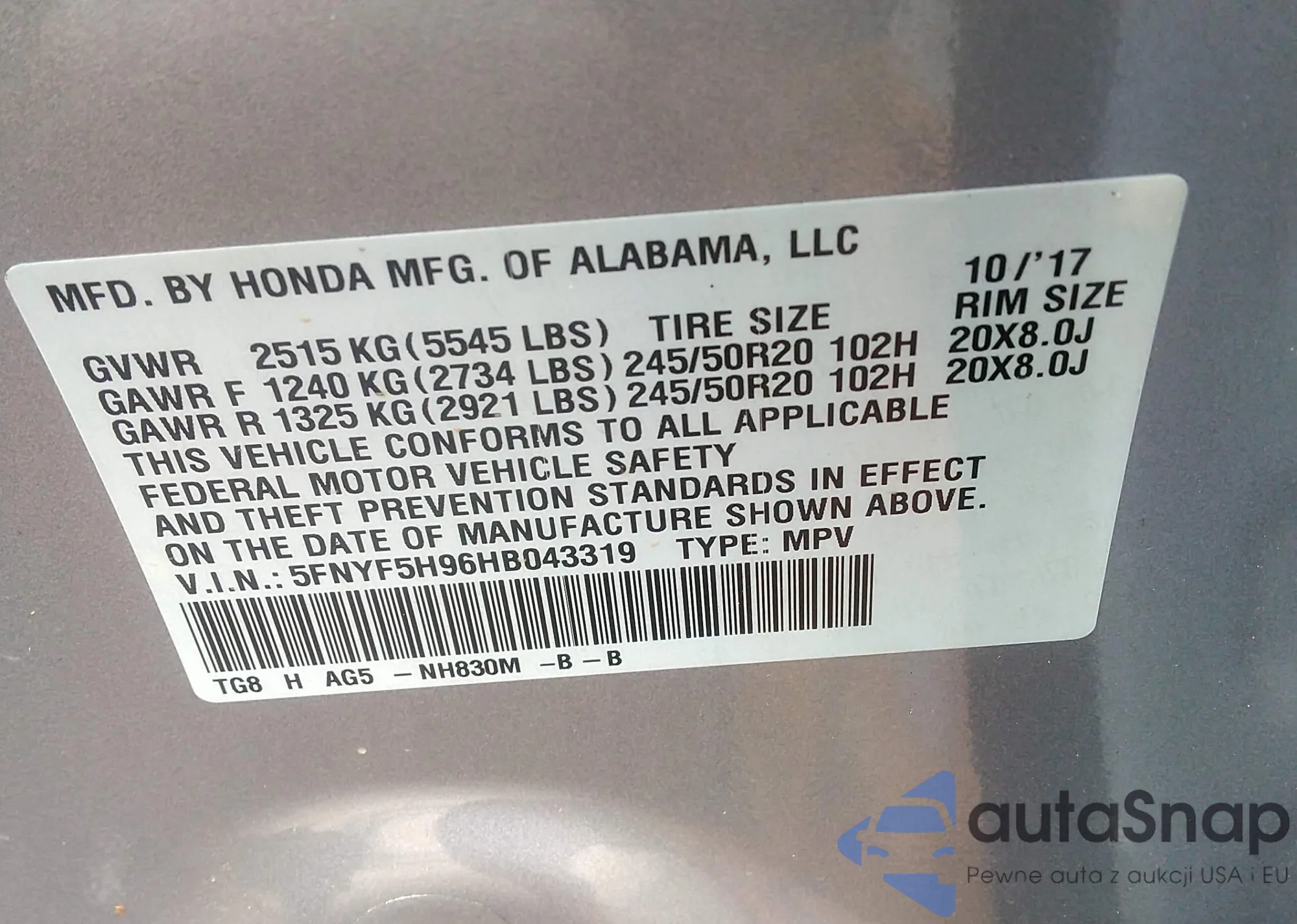 LOT: 42948934 VIN: 5FNYF5H96HB043319