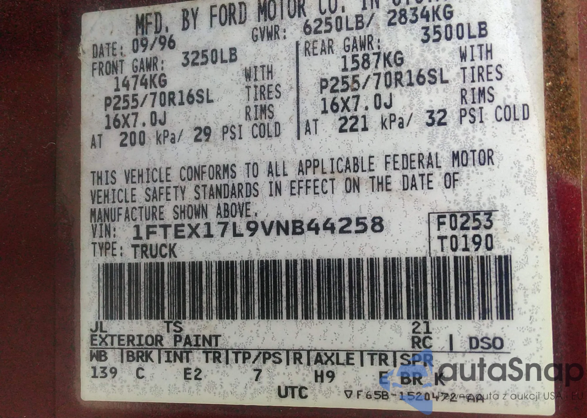 LOT: 42969751 VIN: 1FTEX17L9VNB44258