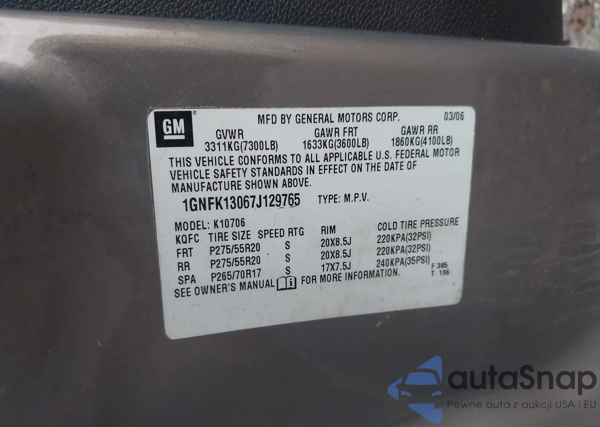 LOT: 42998588 VIN: 1GNFK13067J129765