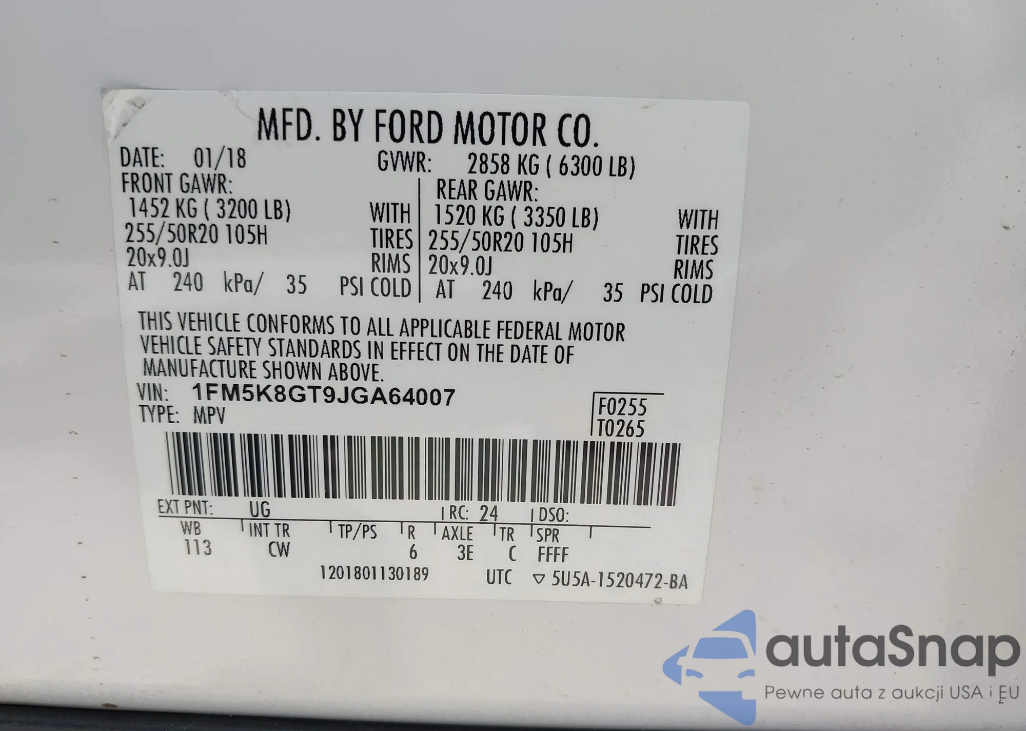 LOT: 42908284 VIN: 1FM5K8GT9JGA64007