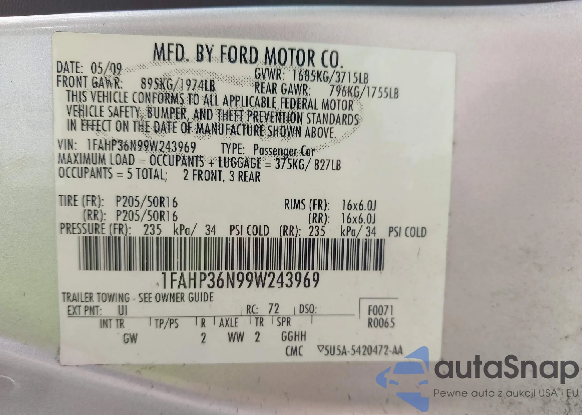 LOT: 42918369 VIN: 1FAHP36N99W243969