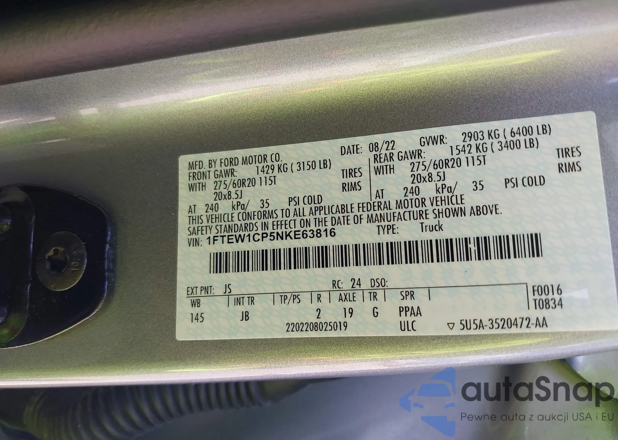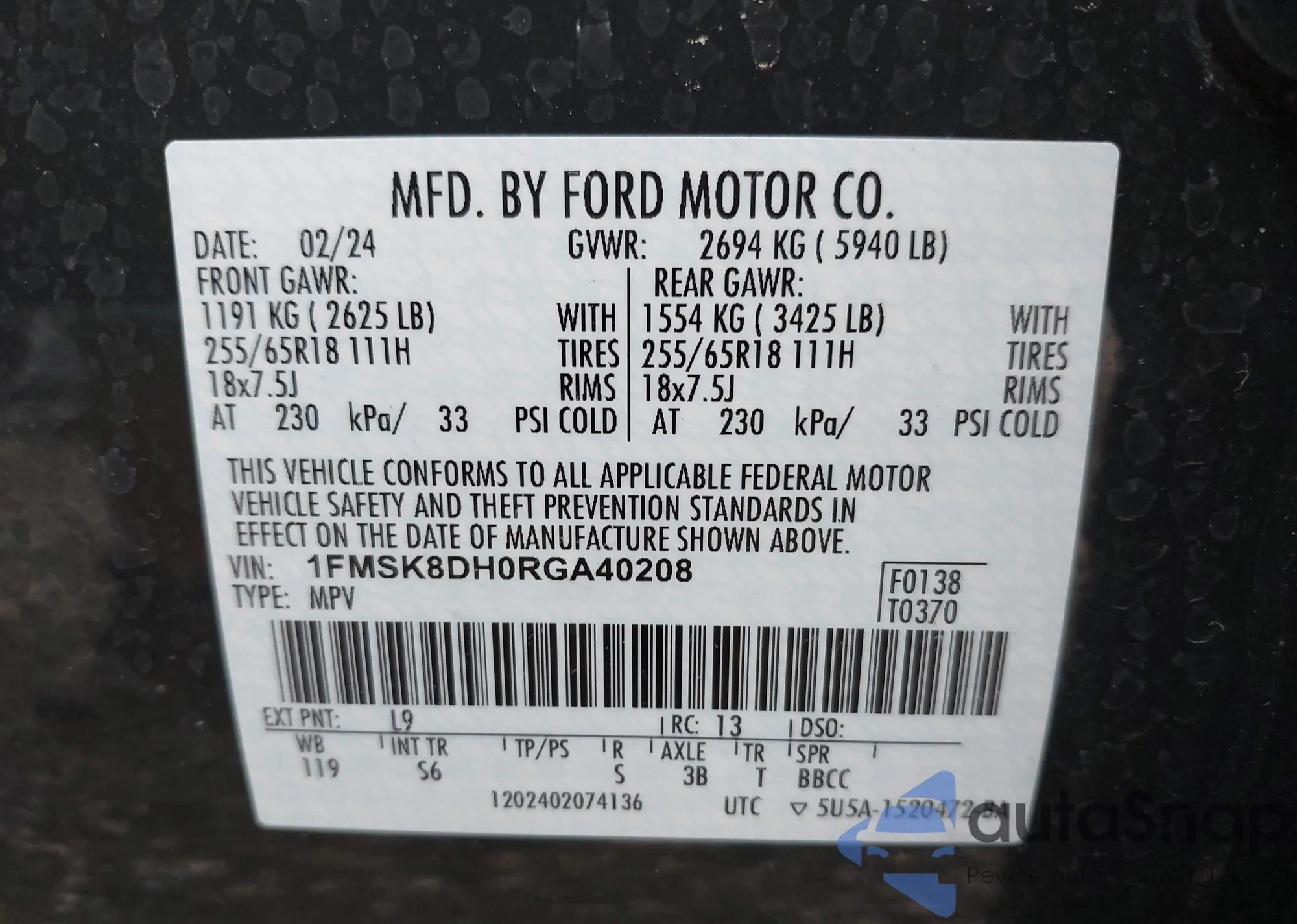 LOT: 42904902 VIN: 1FMSK8DH0RGA40208