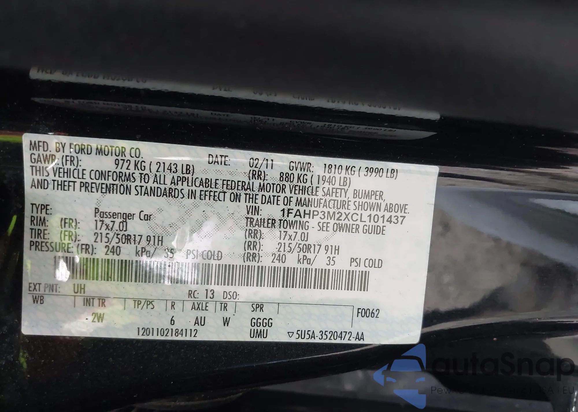 • VIN 1FAHP3M2XCL101437