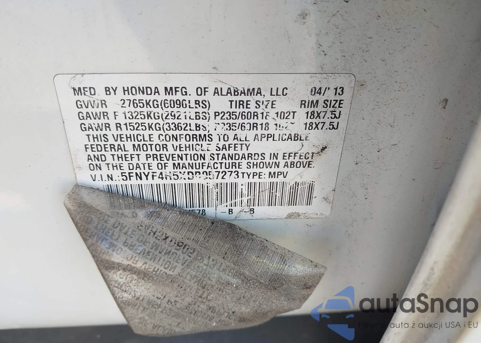 • VIN 5FNYF4H5XDB057273