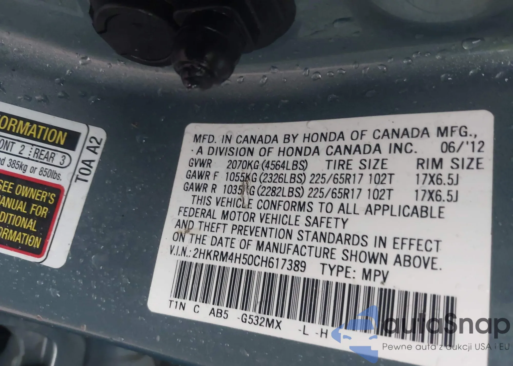 • VIN 2HKRM4H50CH617389