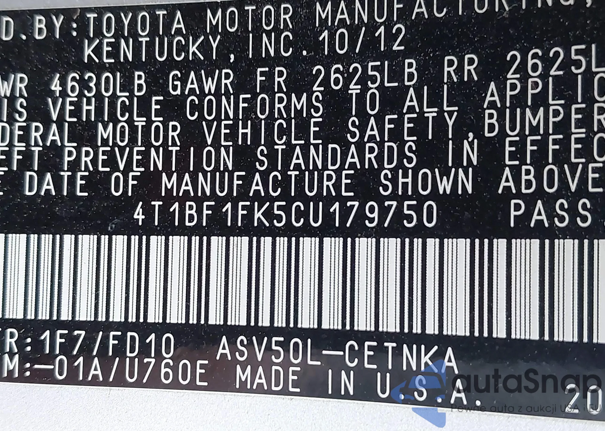 • VIN 4T1BF1FK5CU179750
