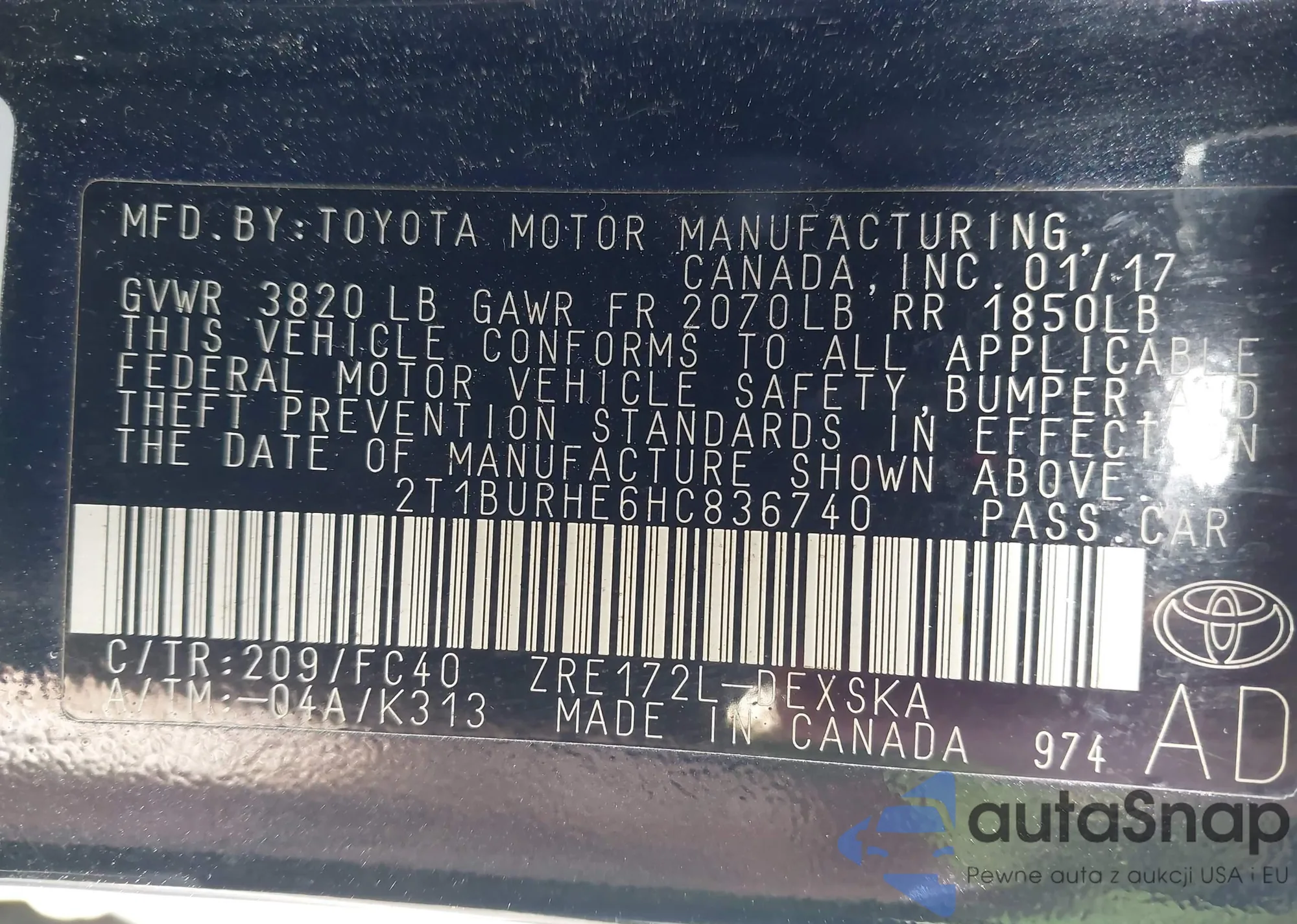LOT: 43103719 VIN: 2T1BURHE6HC836740