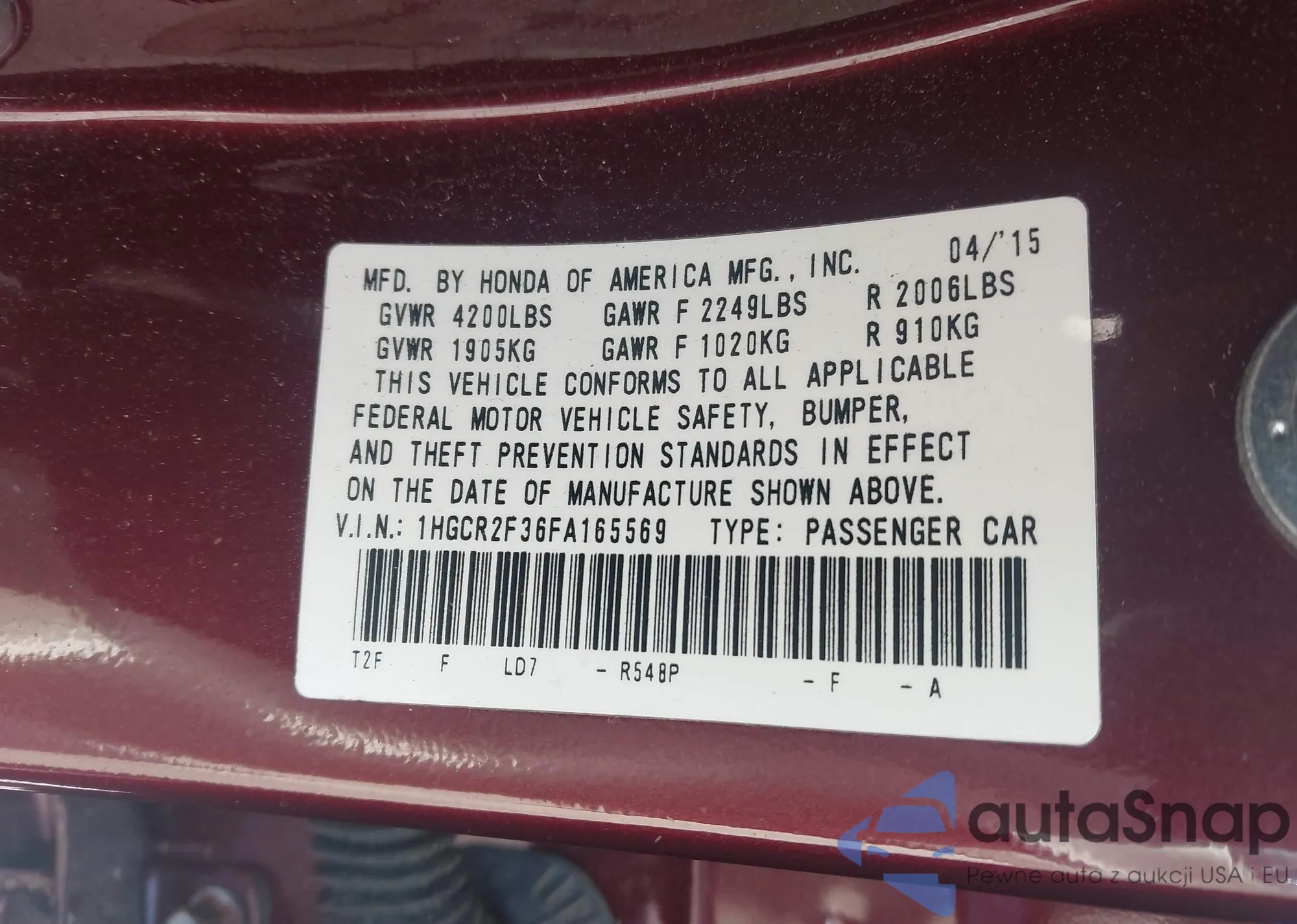 LOT: 43127221 VIN: 1HGCR2F36FA165569