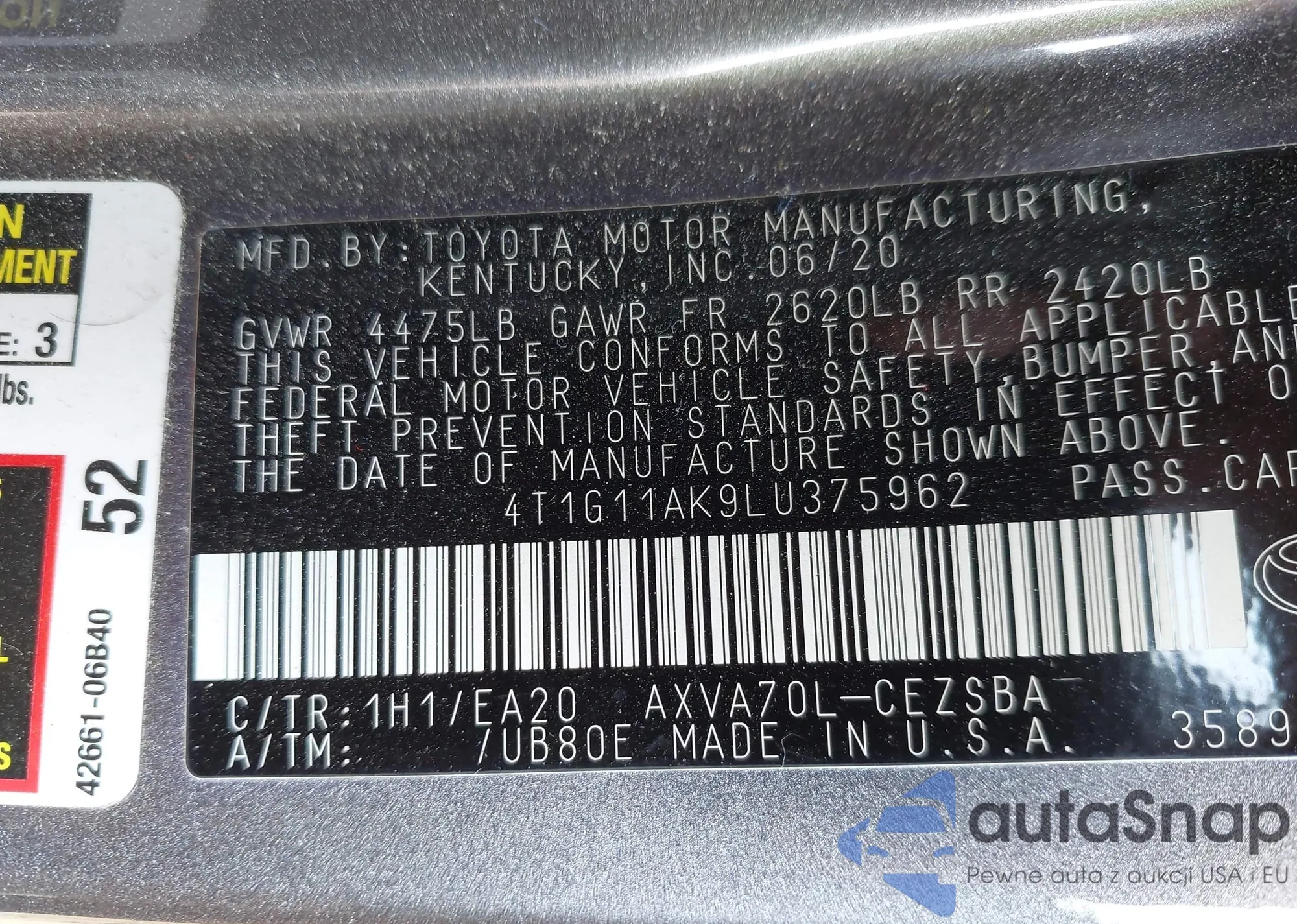 LOT: 43175368 VIN: 4T1G11AK9LU375962