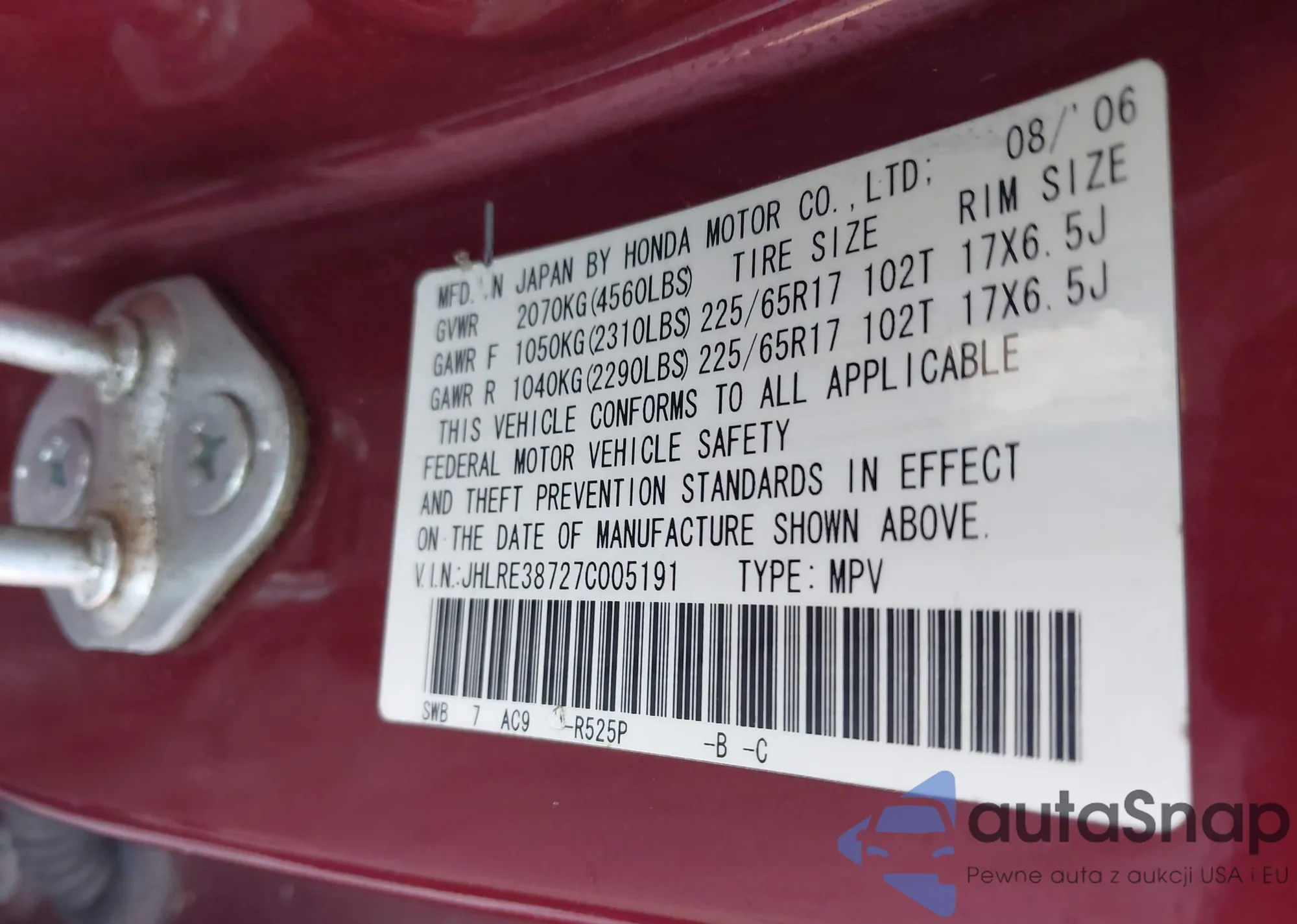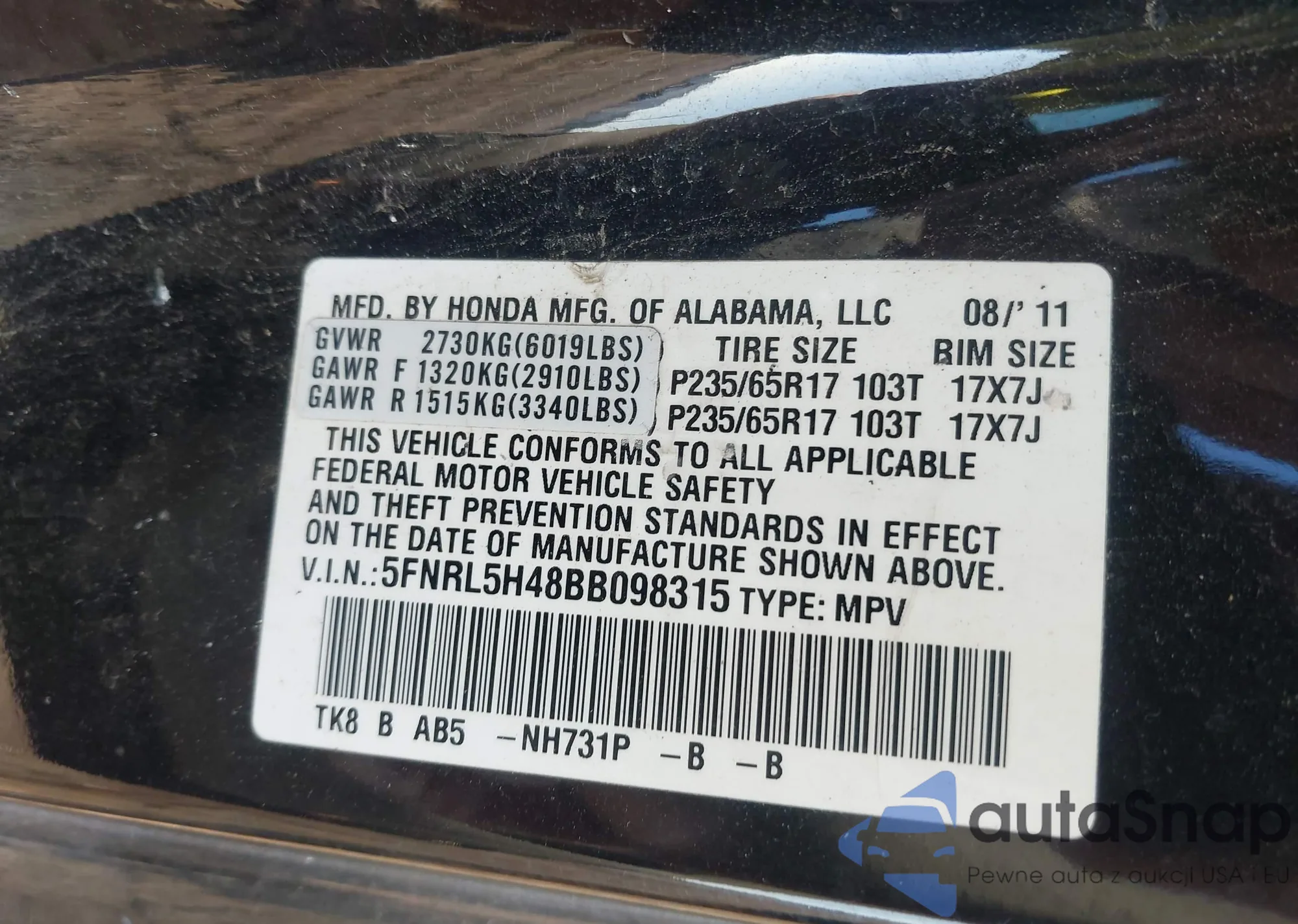 • VIN 5FNRL5H48BB098315