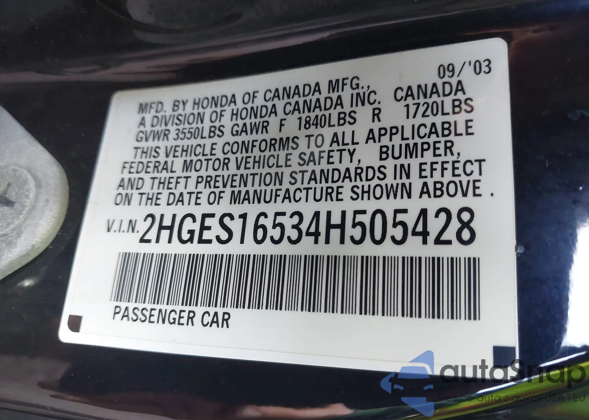 LOT: 42840567 VIN: 2HGES16521H532602