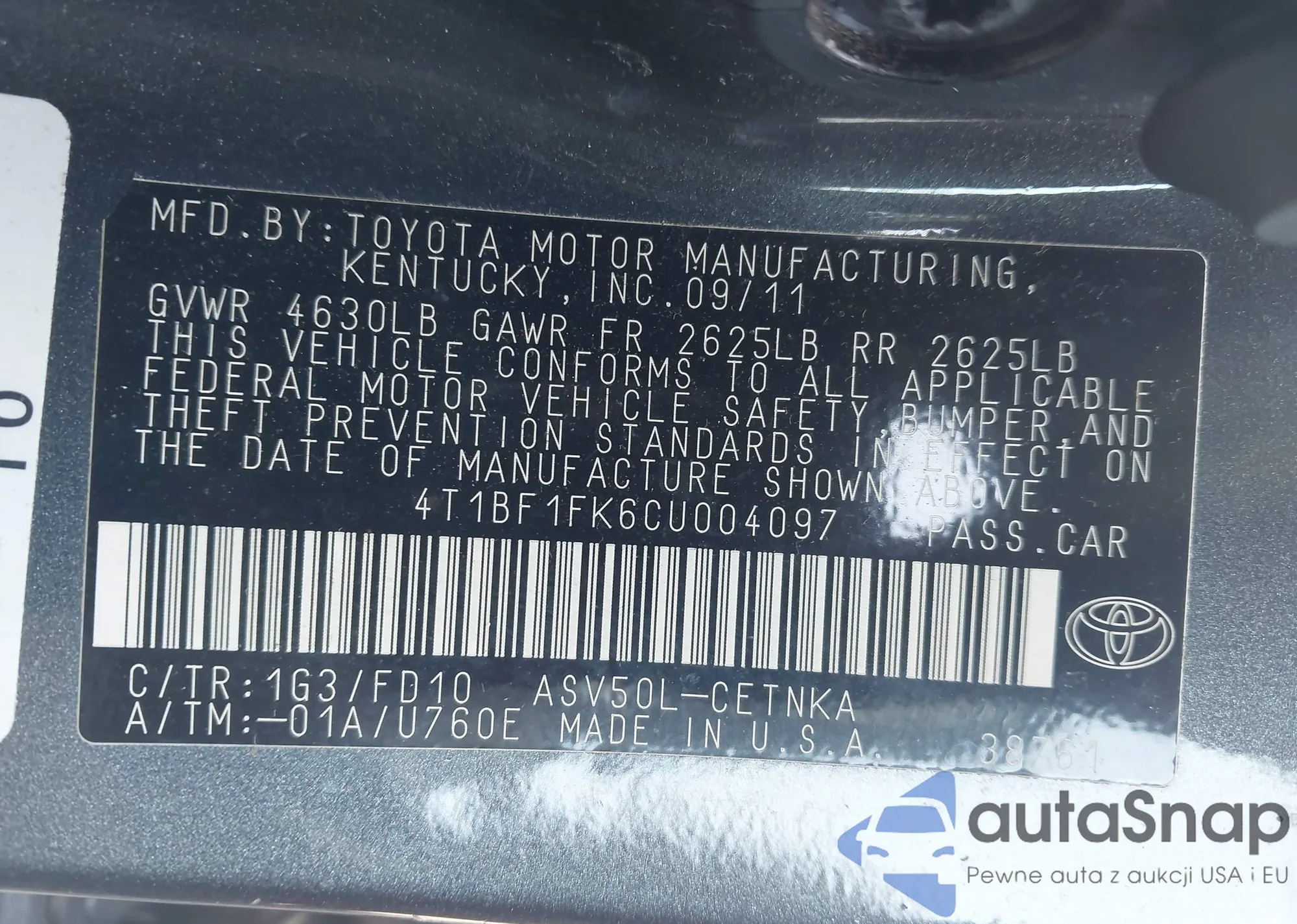 • VIN 4T1BF1FK6CU004097
