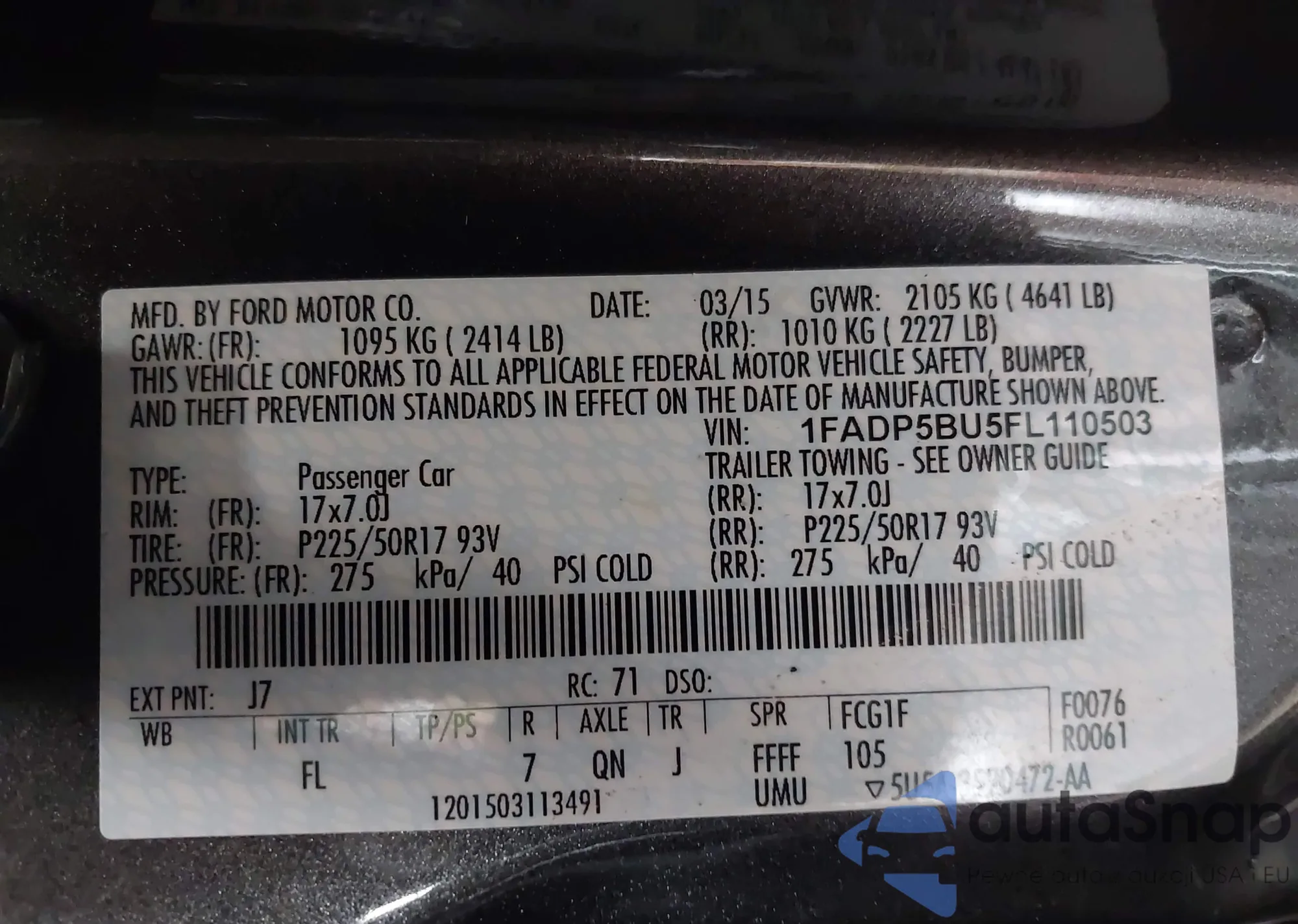 • VIN 1FADP5BU5FL110503