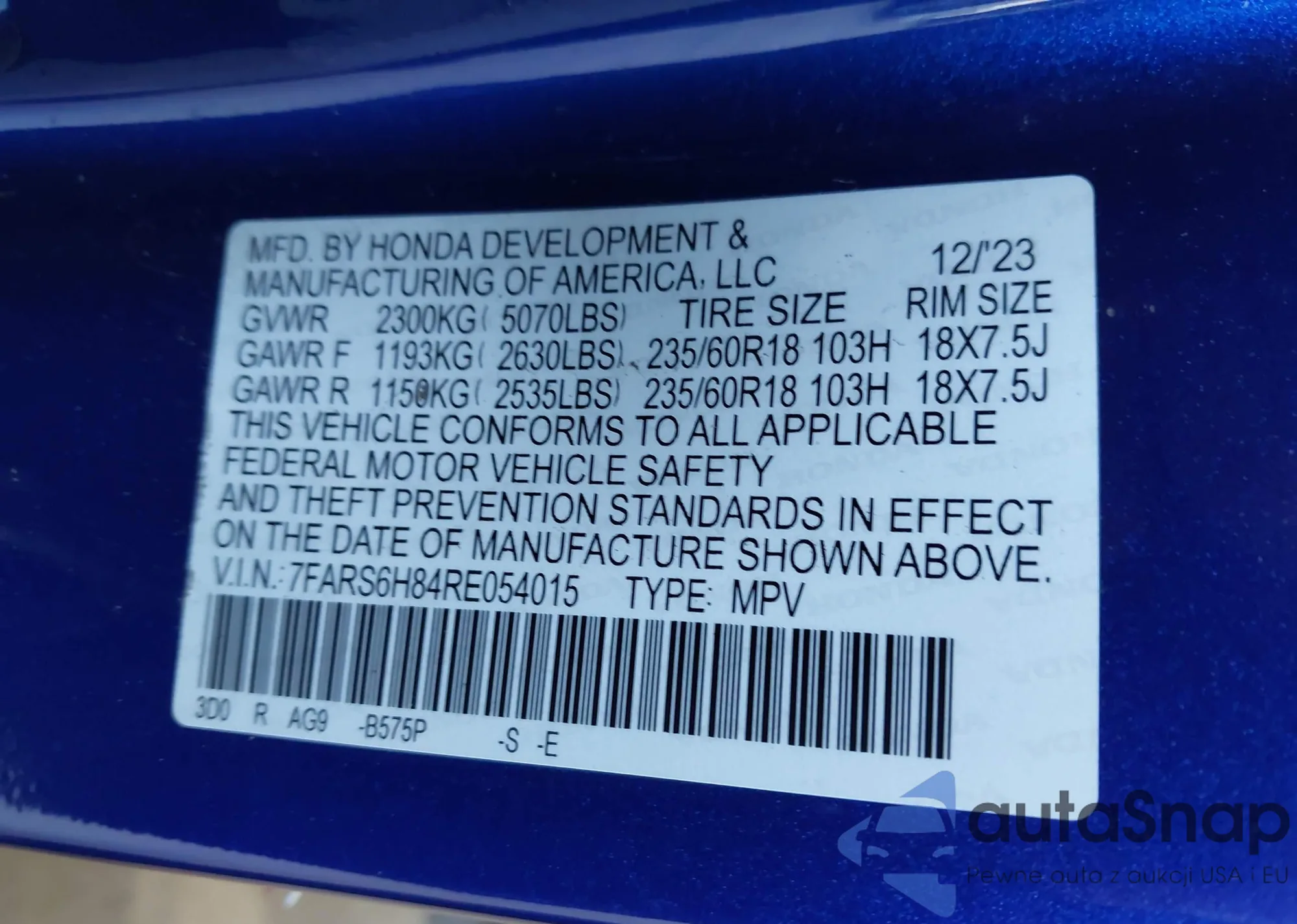 • VIN 7FARS6H84RE054015