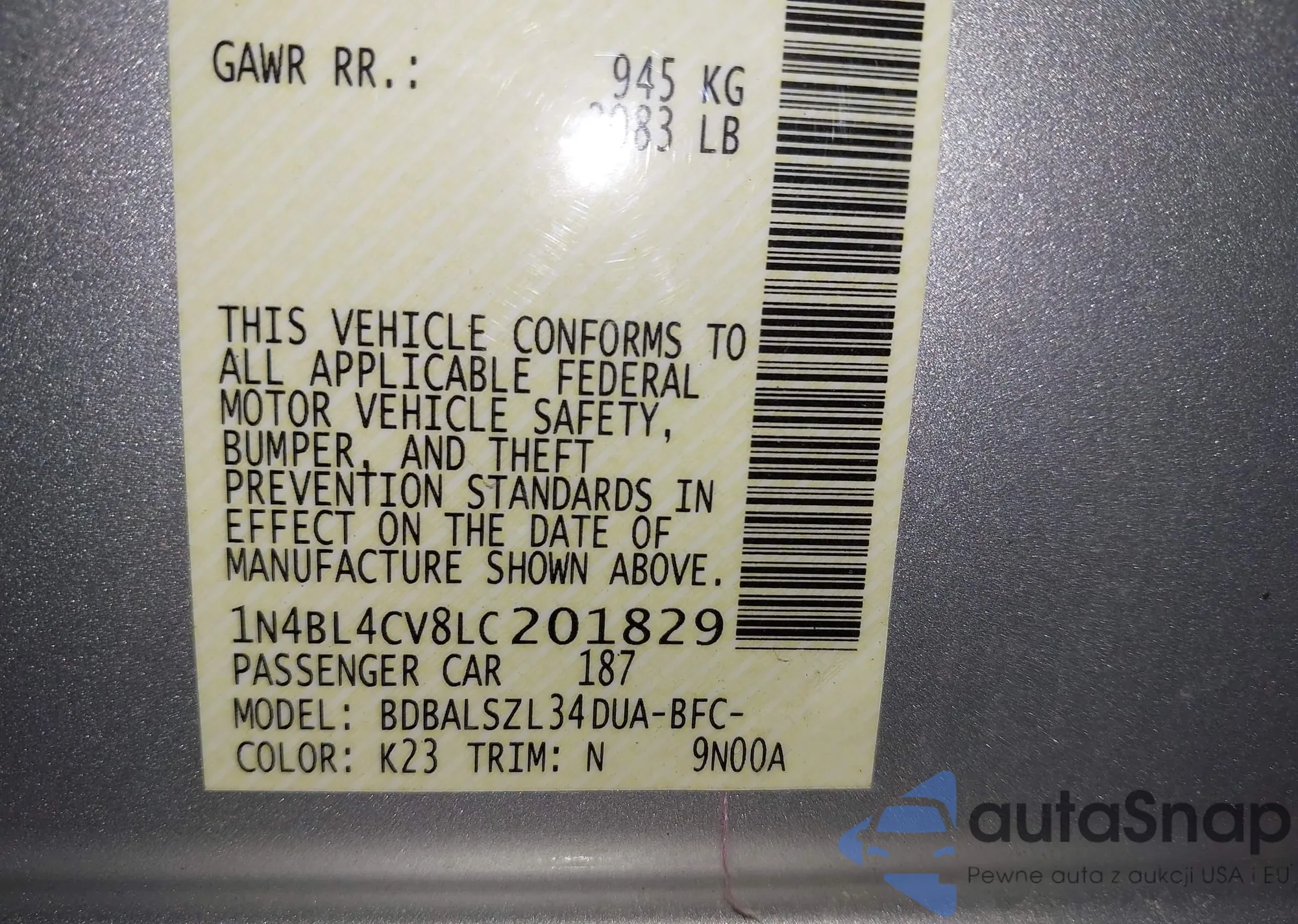 • VIN 1N4BL4CV8LC201829