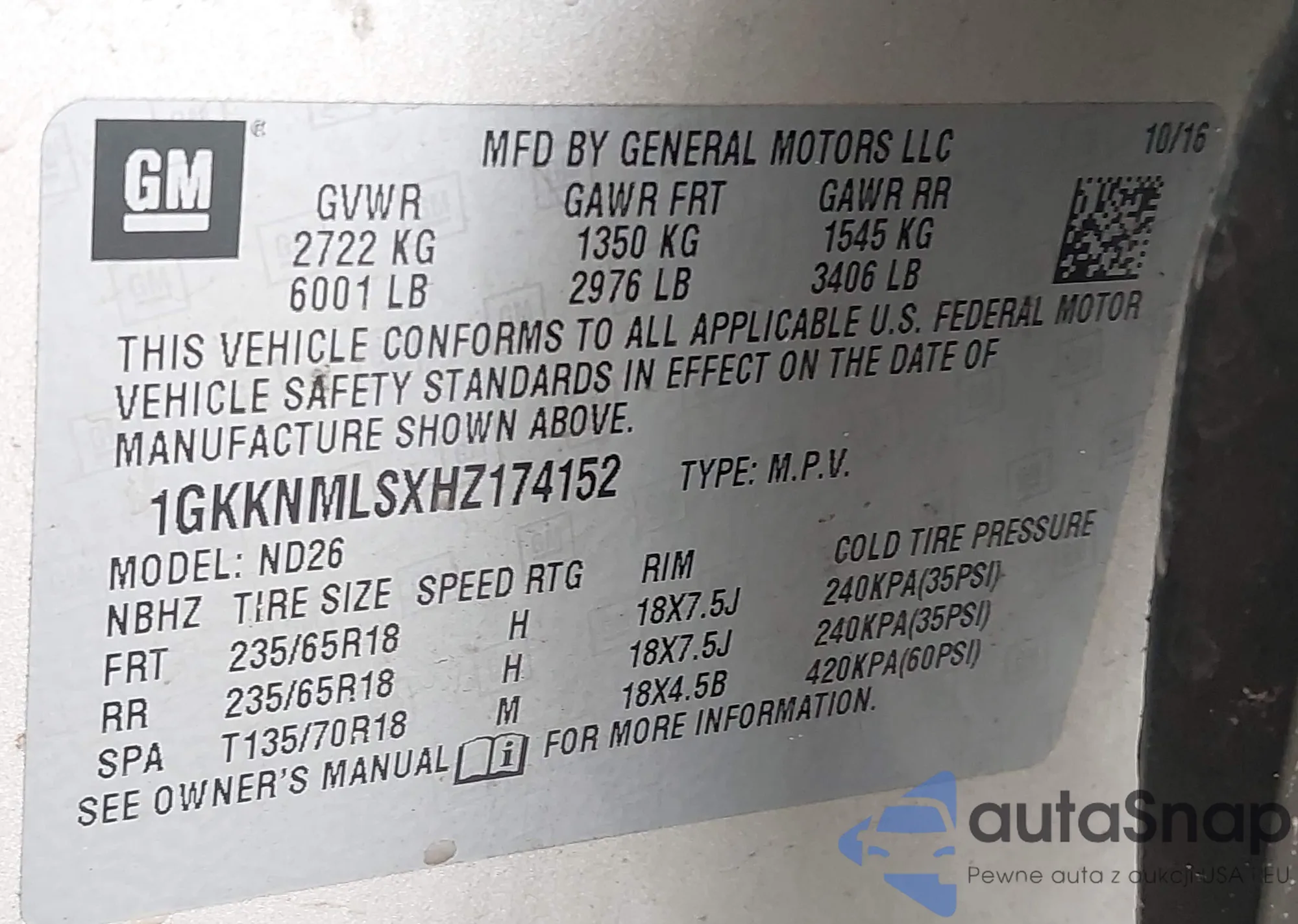 LOT: 43016604 VIN: 1GKKNMLSXHZ174152