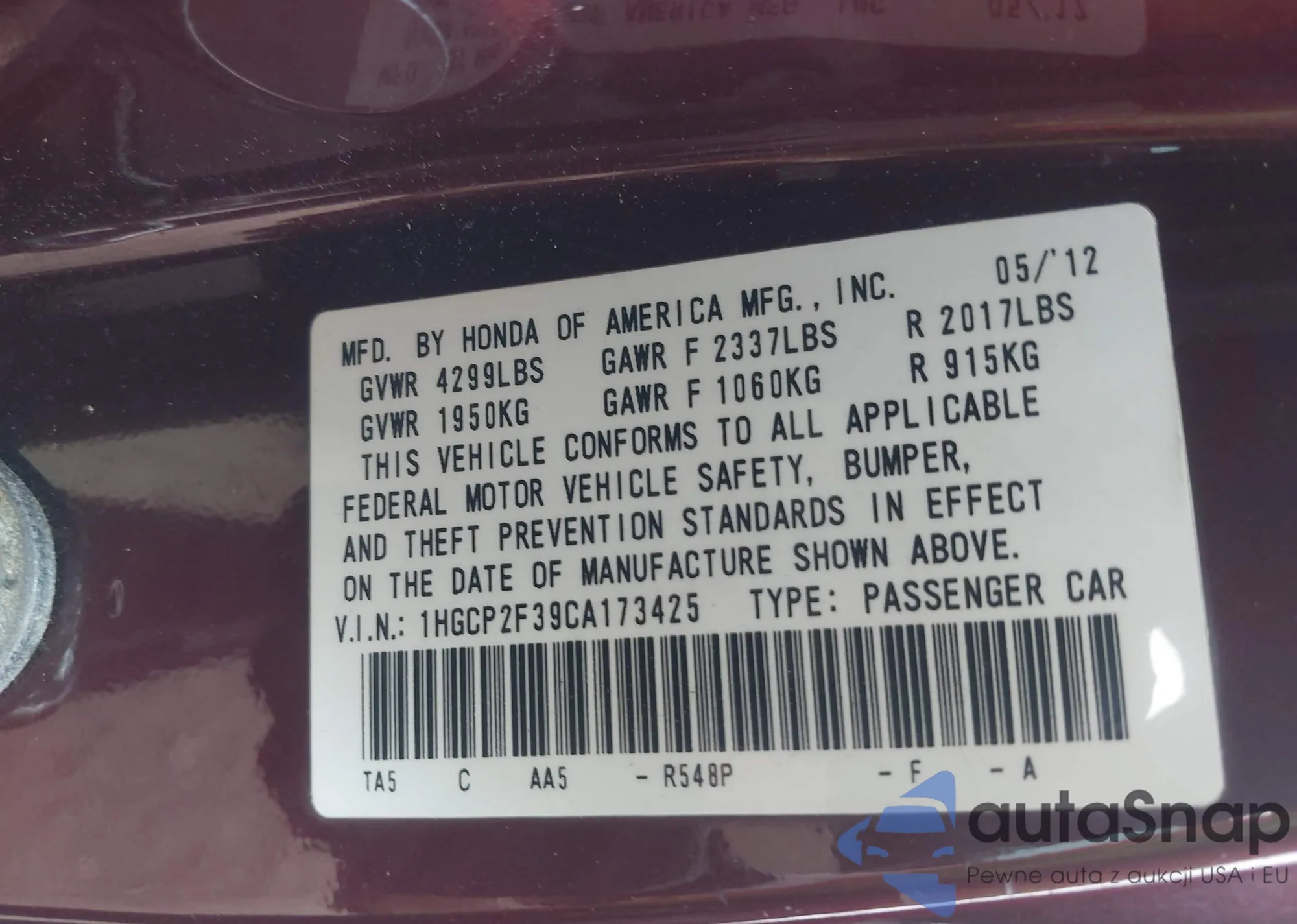 LOT: 42524933 VIN: 1HGCP2F39CA173425