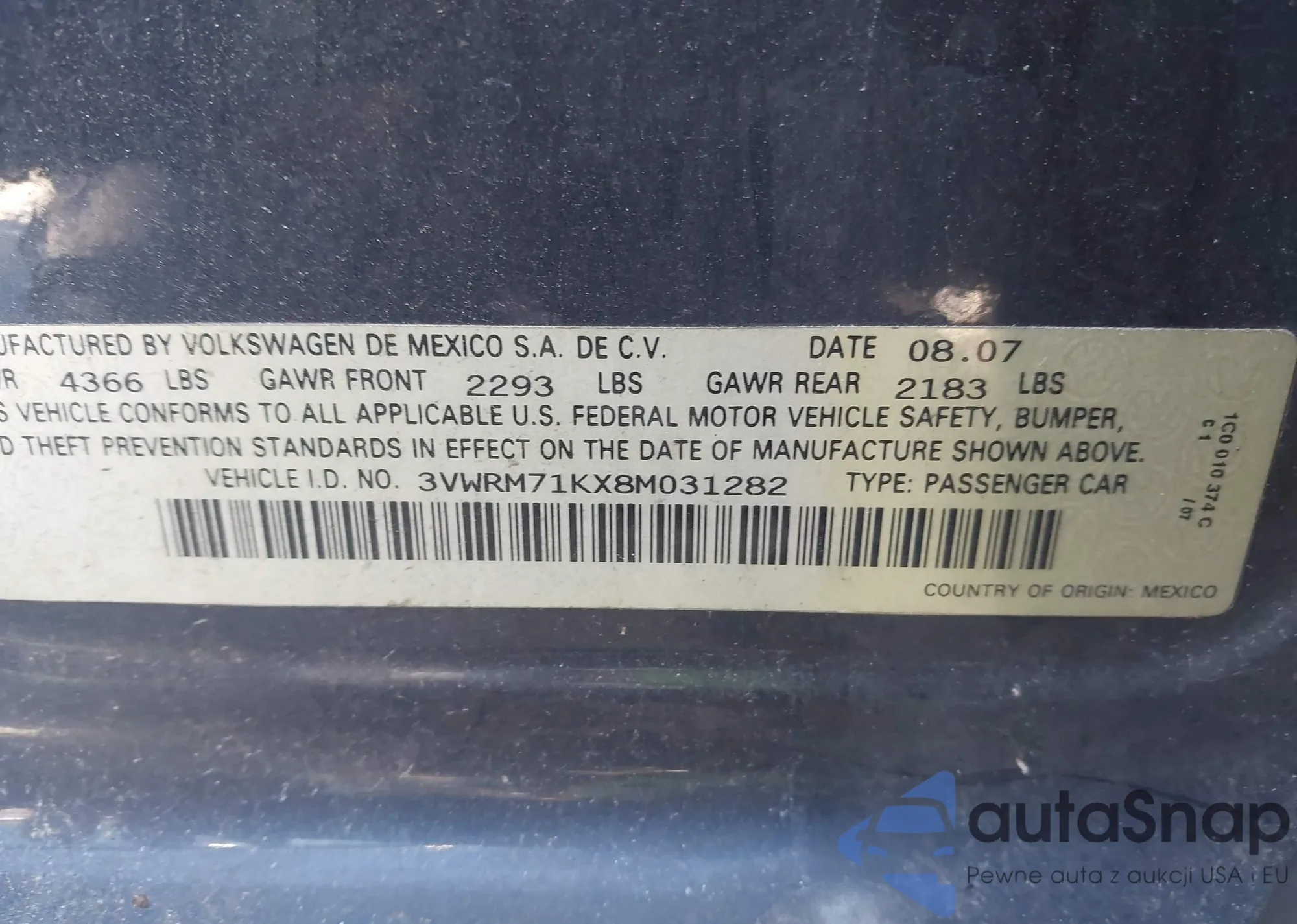 LOT: 43057260 VIN: 3VWRM71KX8M031282