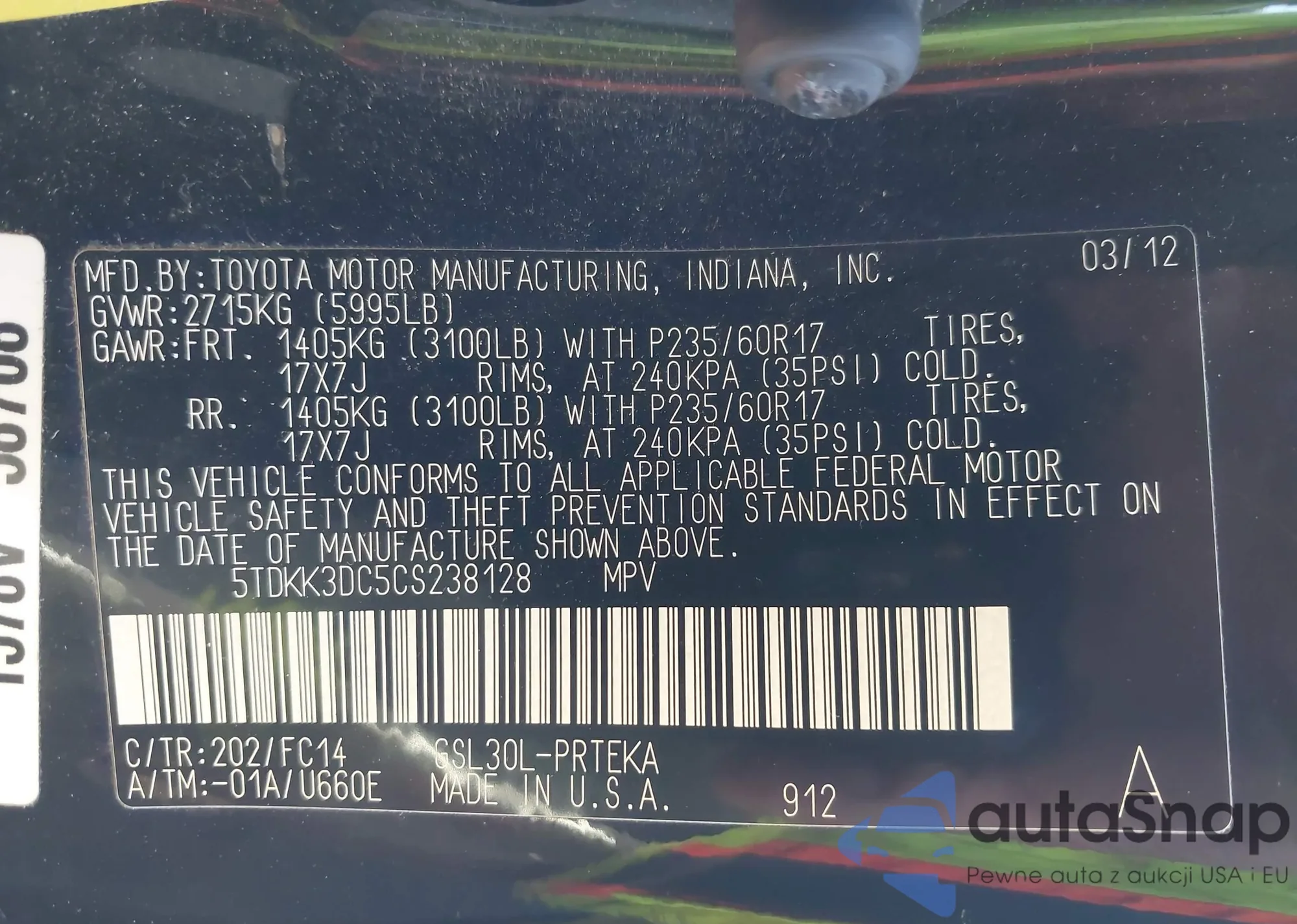 LOT: 43015762 VIN: 5TDKK3DC5CS238128