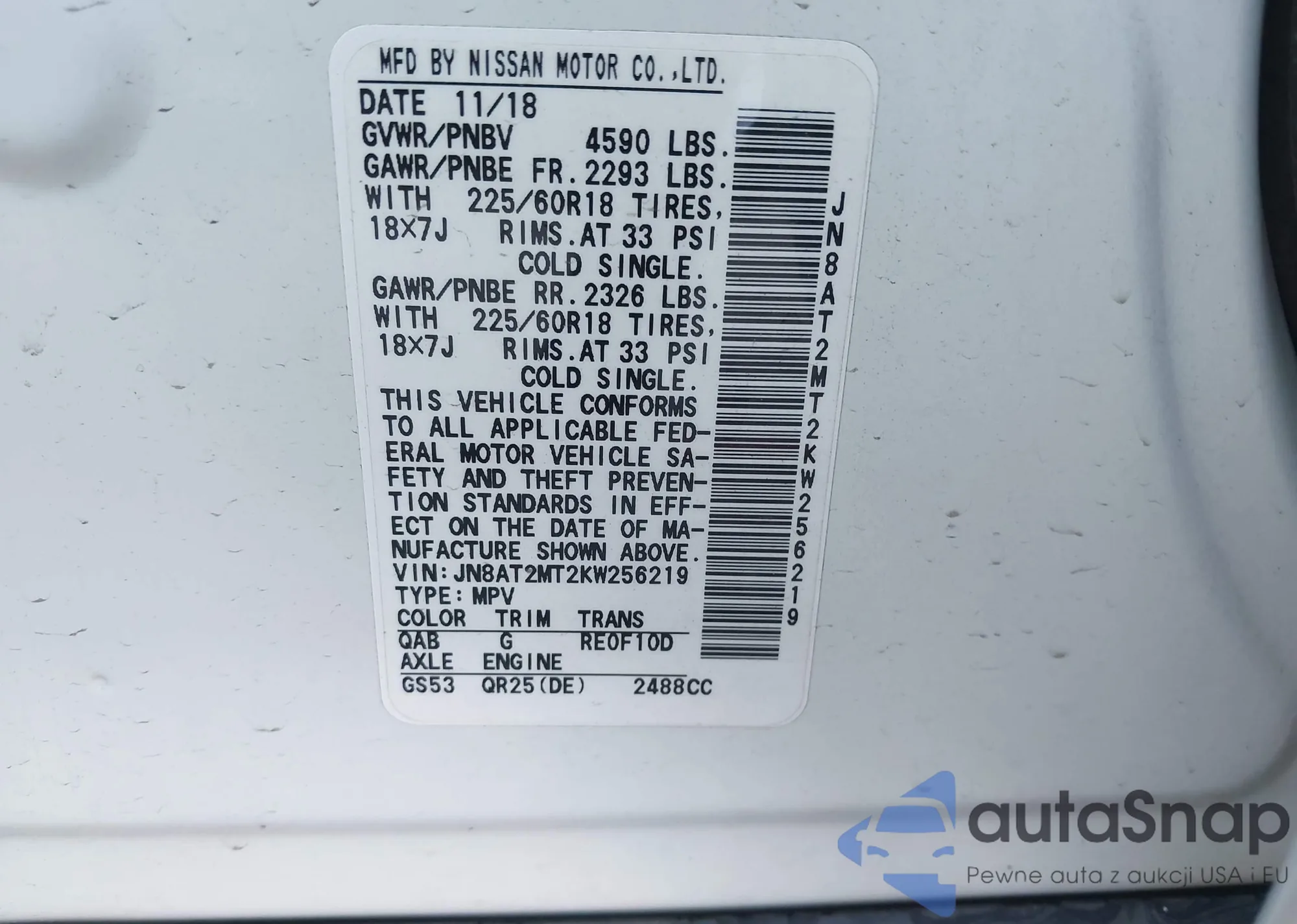 LOT: 43099682 VIN: JN8AT2MT2KW256219