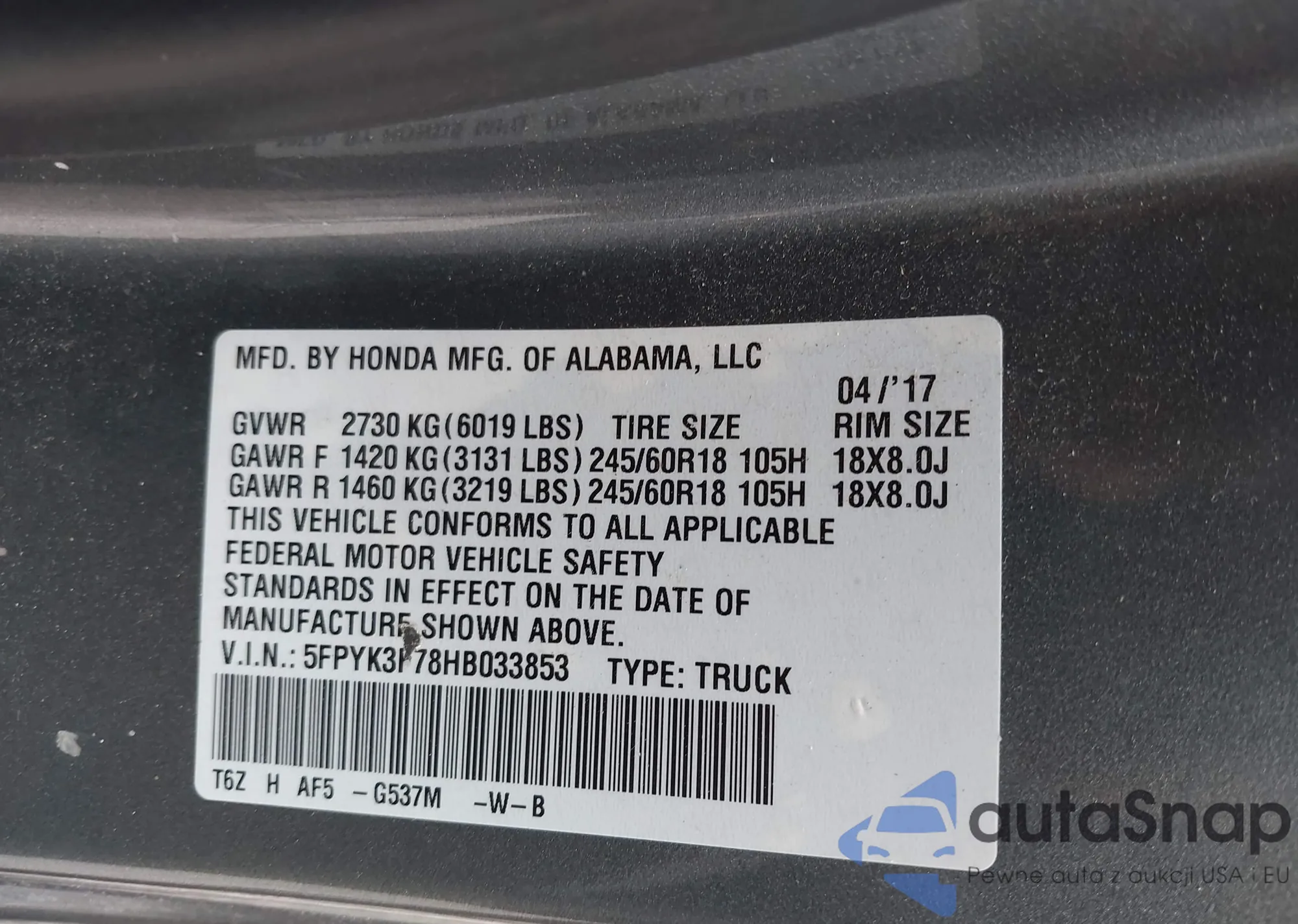 LOT: 42837904 VIN: 2HGFG3B81FH503648