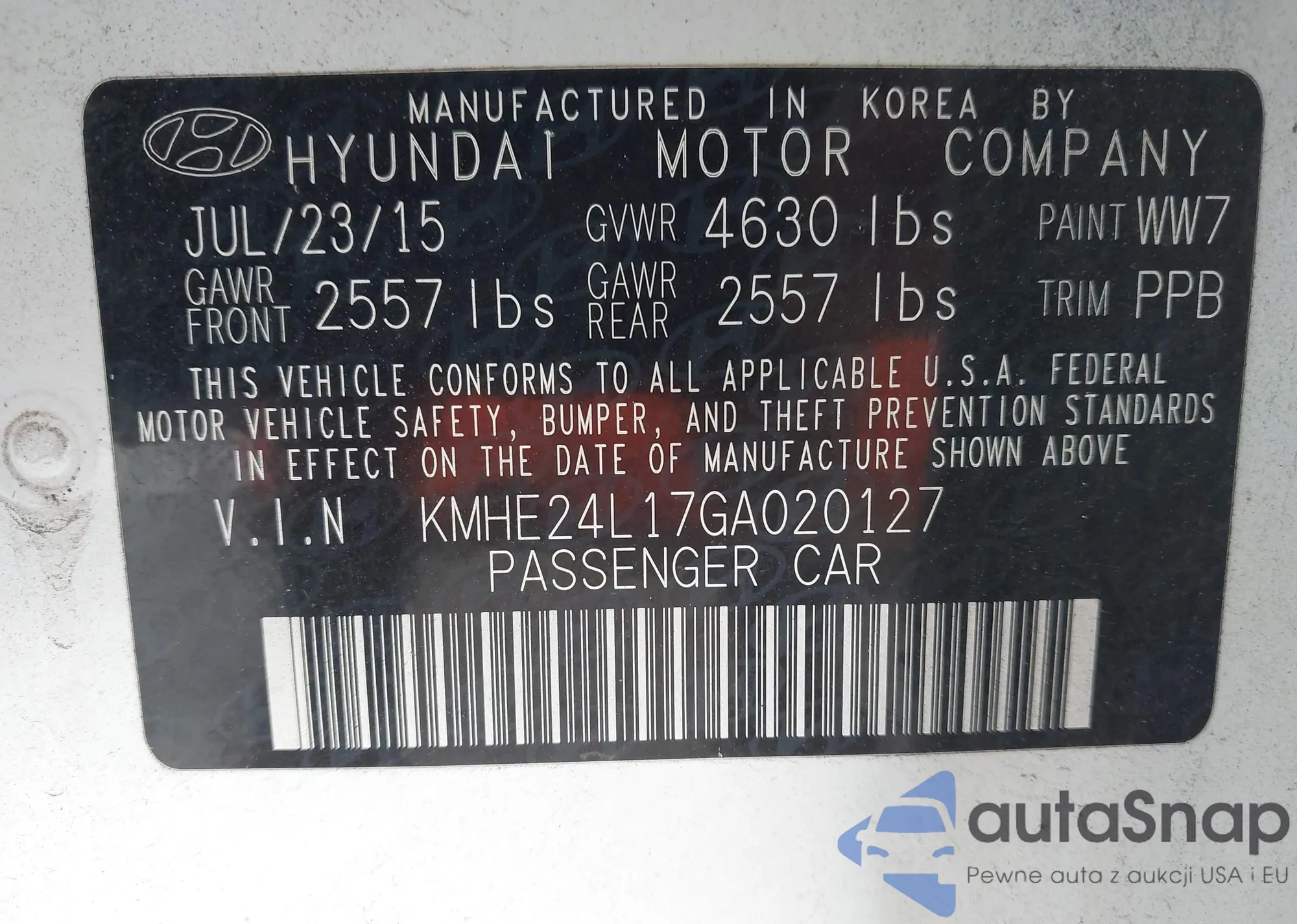 LOT: 43117140 VIN: KMHE24L17GA020127