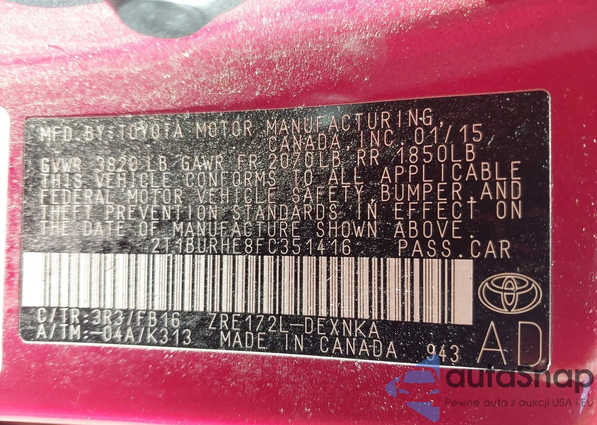 LOT: 43075401 VIN: 2T1BURHE8FC351416