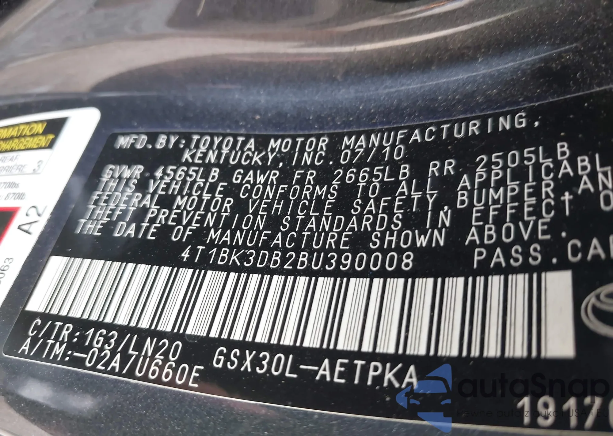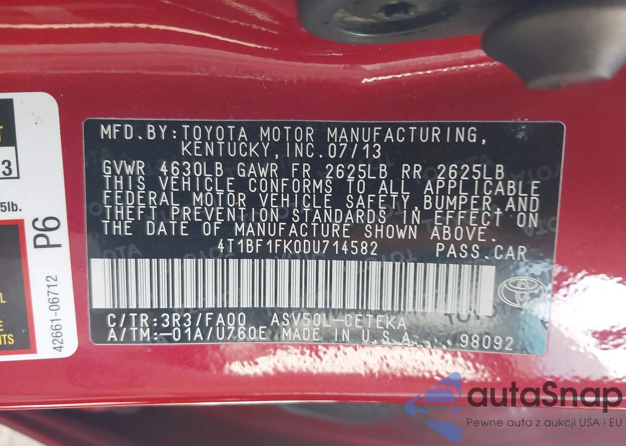 LOT: 42368744 VIN: 4T1BF1FK0DU714582