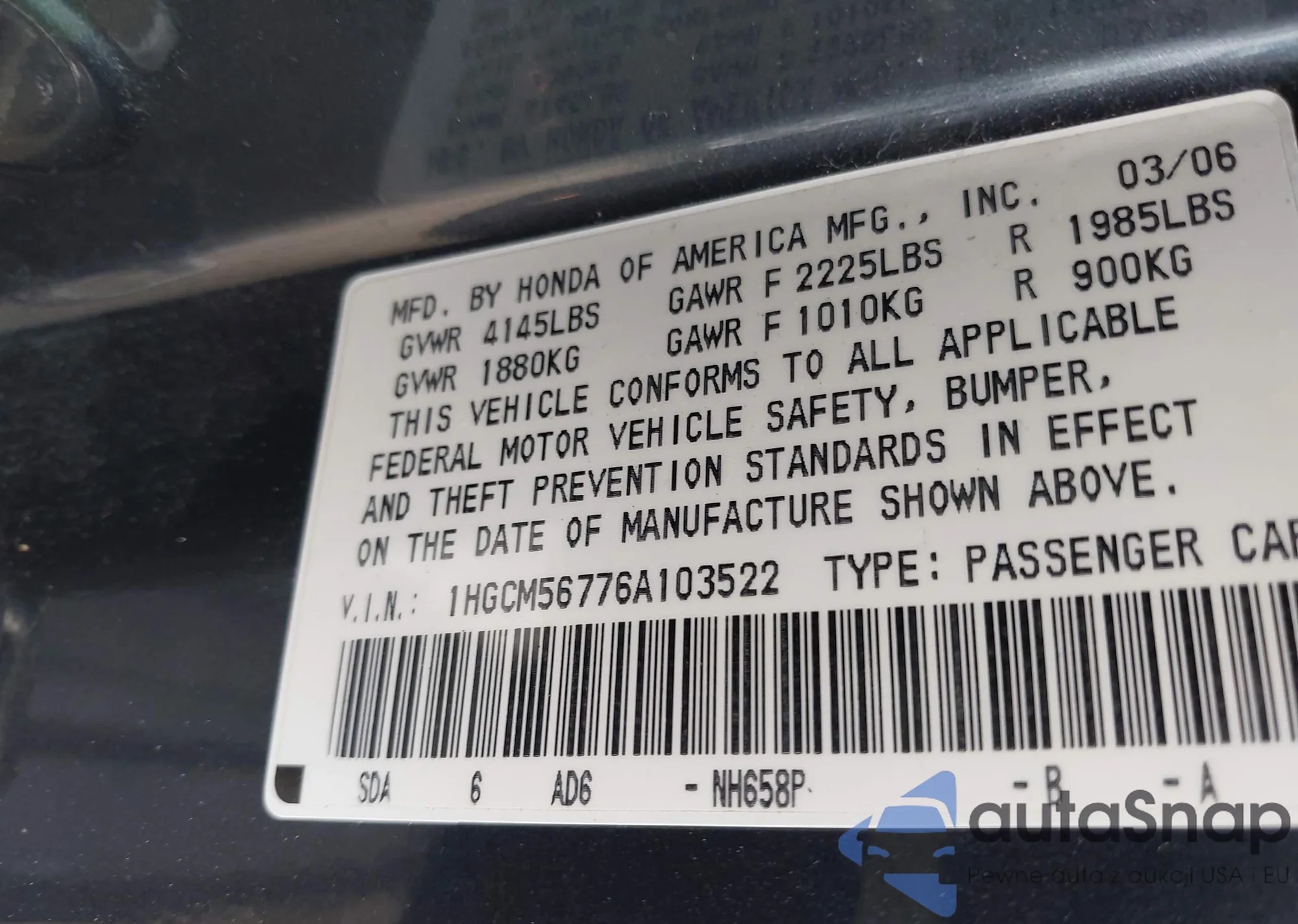 • VIN 1HGCM56776A103522