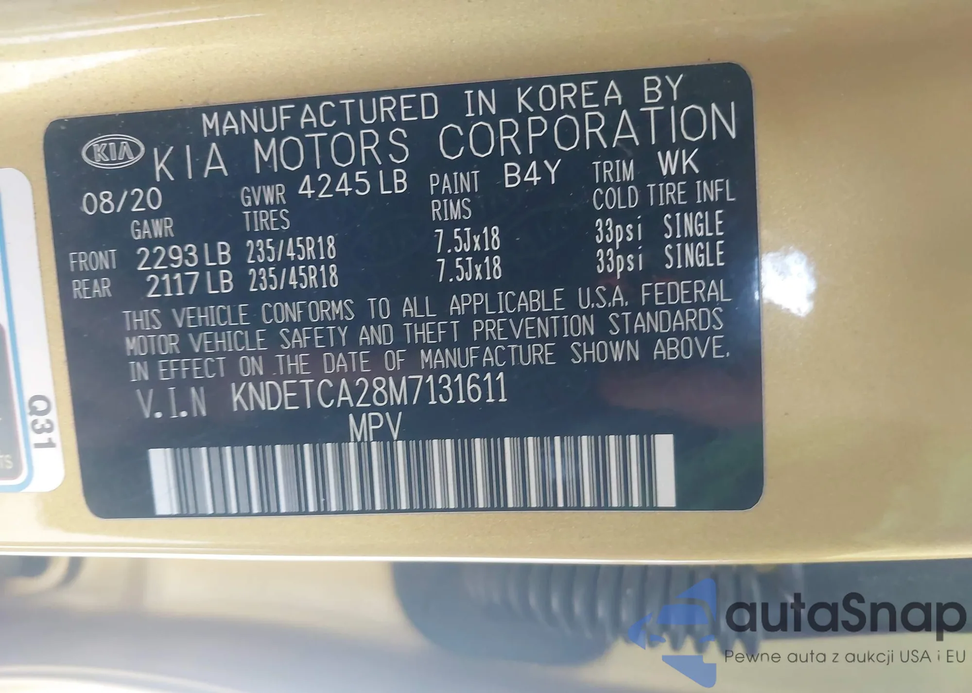LOT: 43113246 VIN: KNDETCA28M7131611