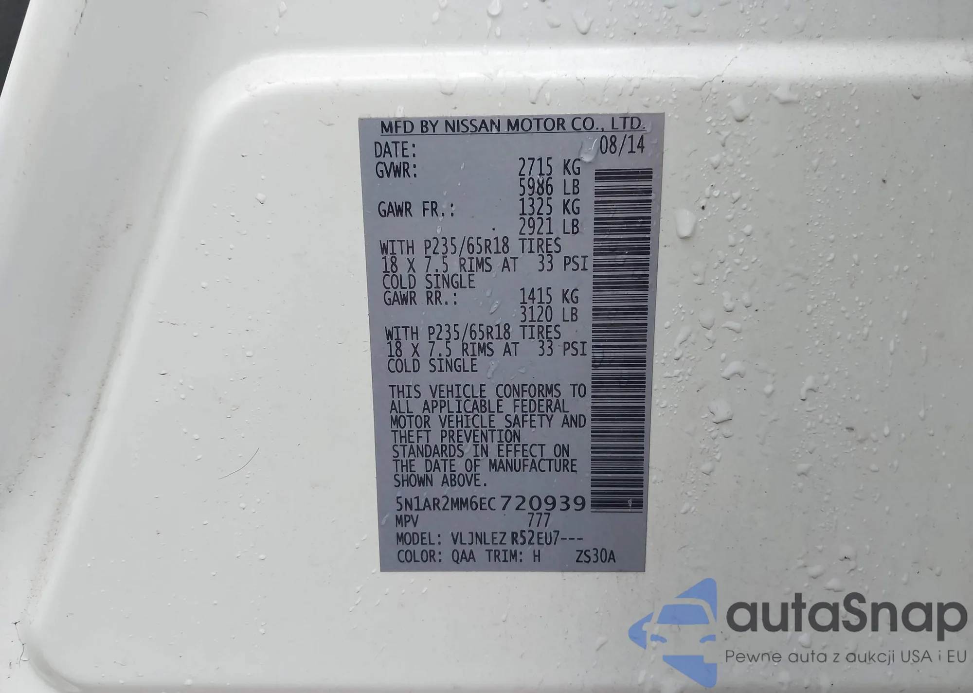 LOT: 43124927 VIN: 5N1AR2MM6EC720939