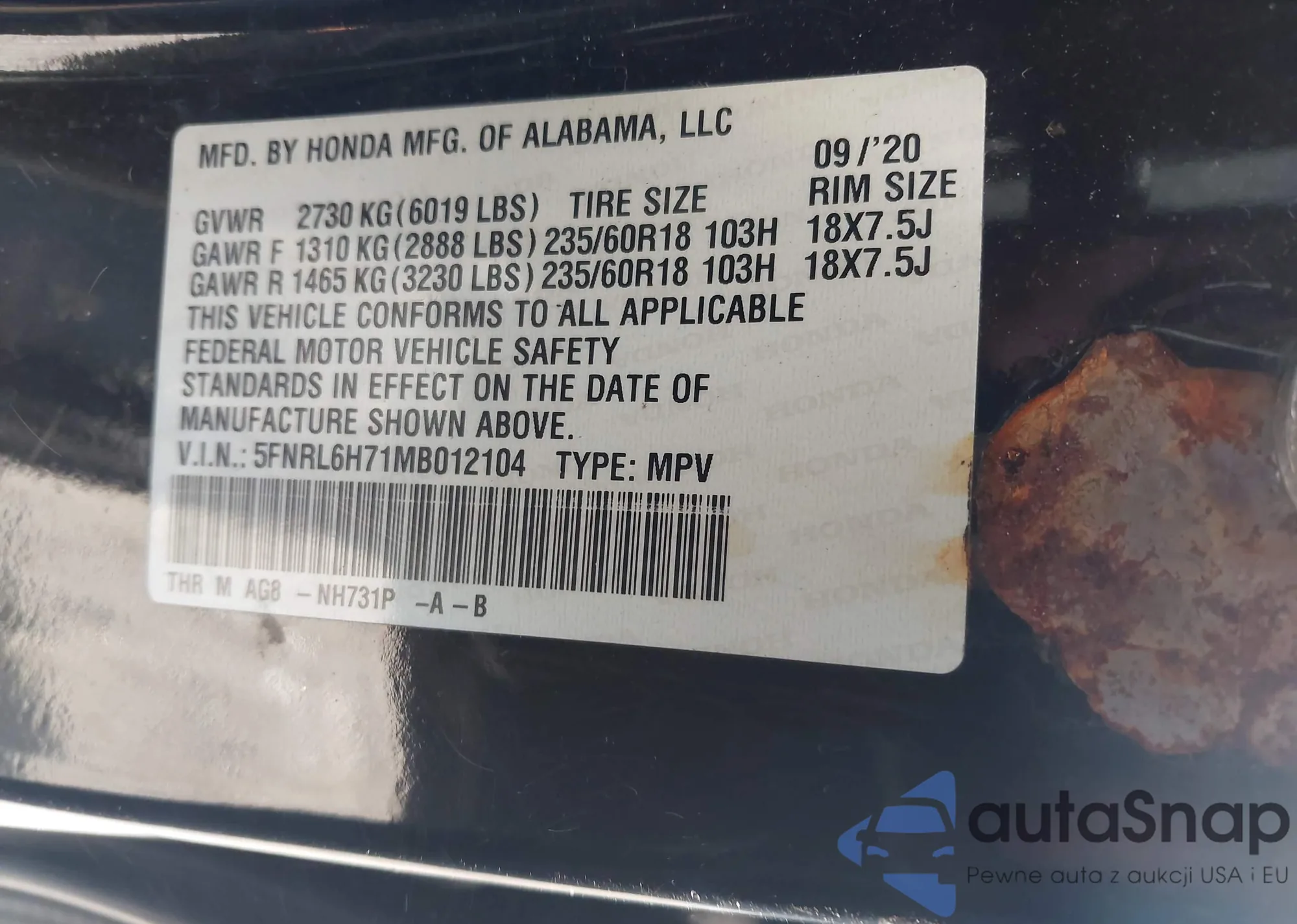• VIN 5FNRL6H71MB012104