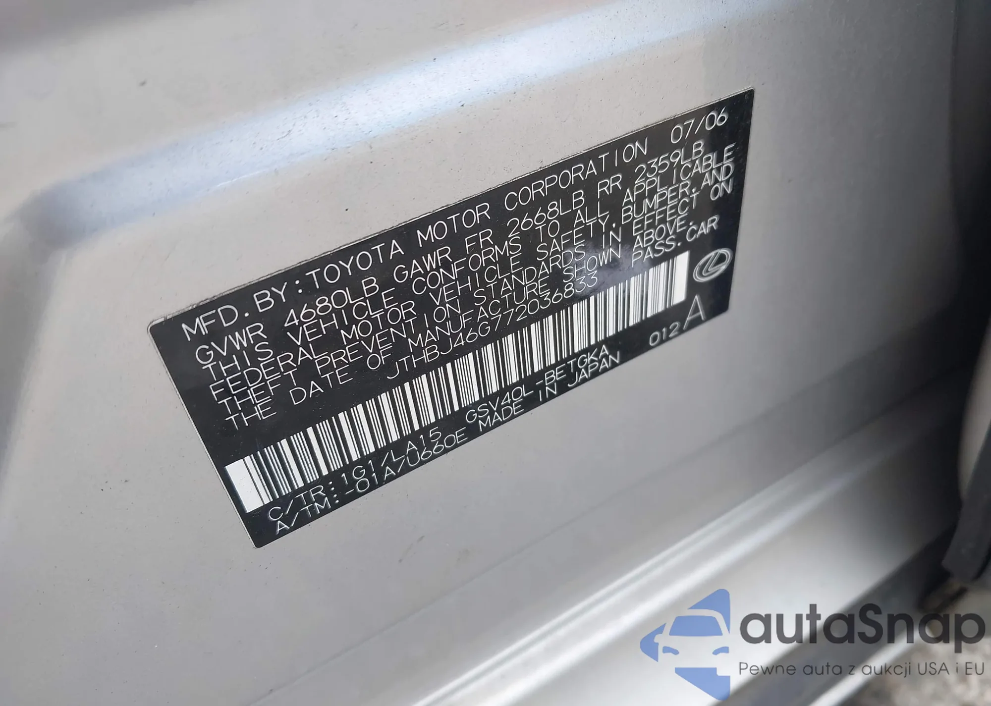 LOT: 43112948 VIN: JTHBJ46G772036833