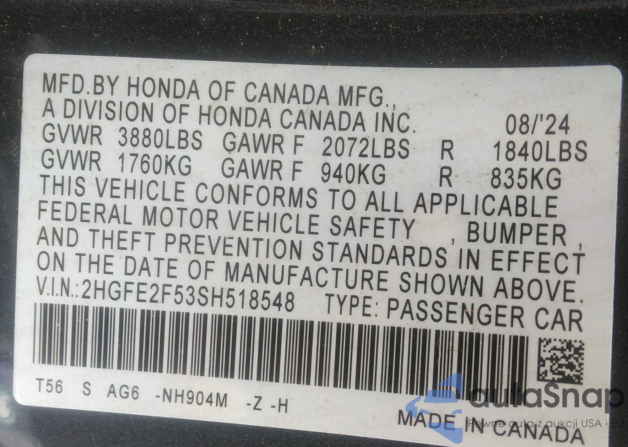 LOT: 42814973 VIN: 2HGFE2F53SH518548
