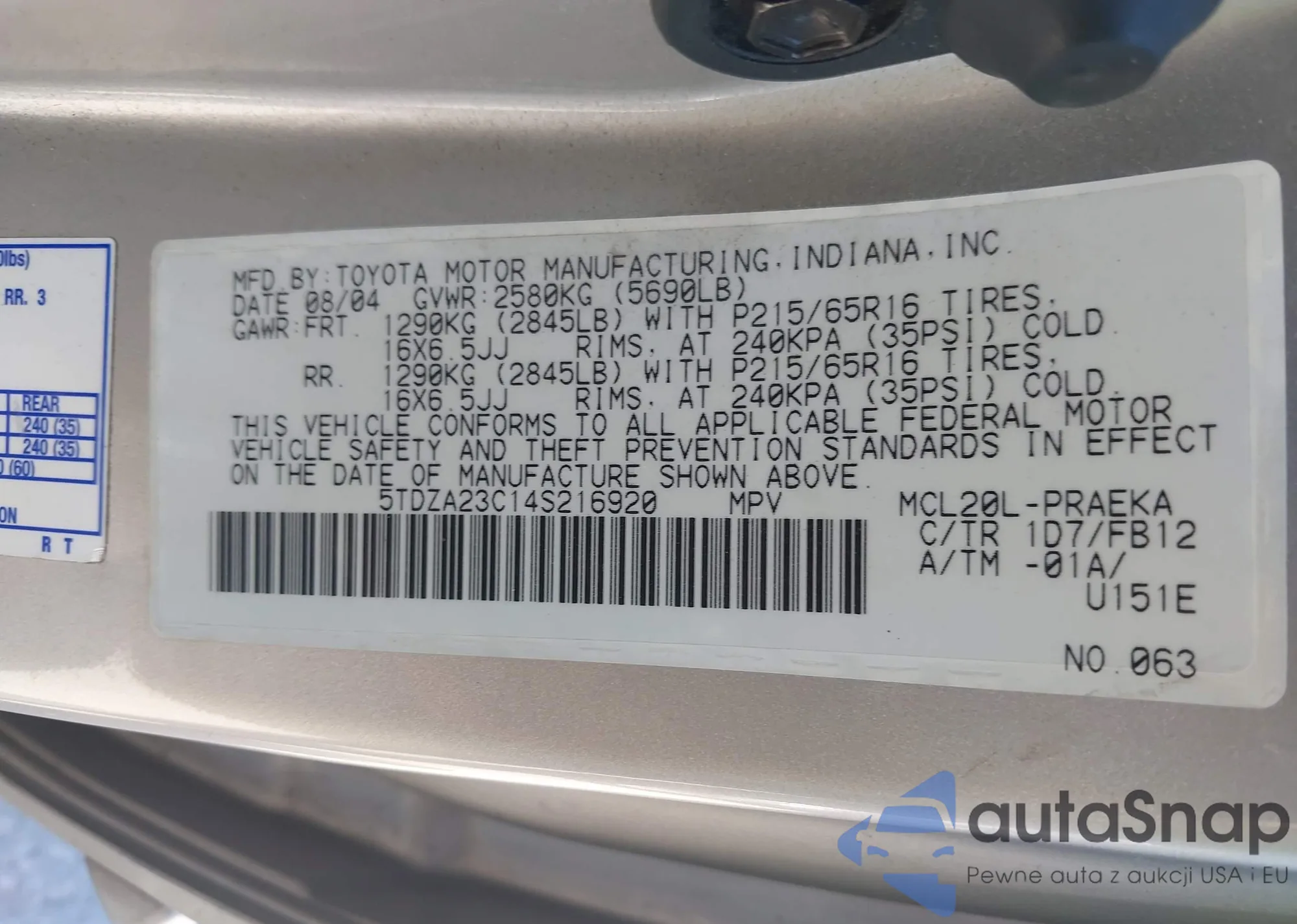 • VIN 5TDZA23C14S216920