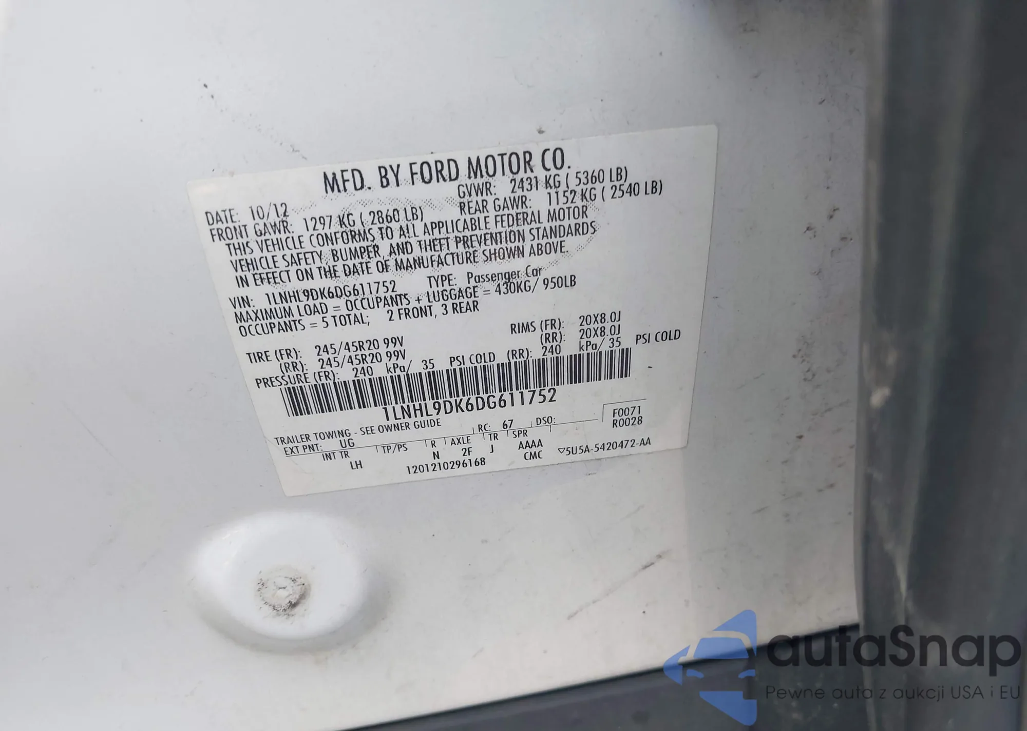LOT: 43254456 VIN: 1LNHL9DK6DG611752