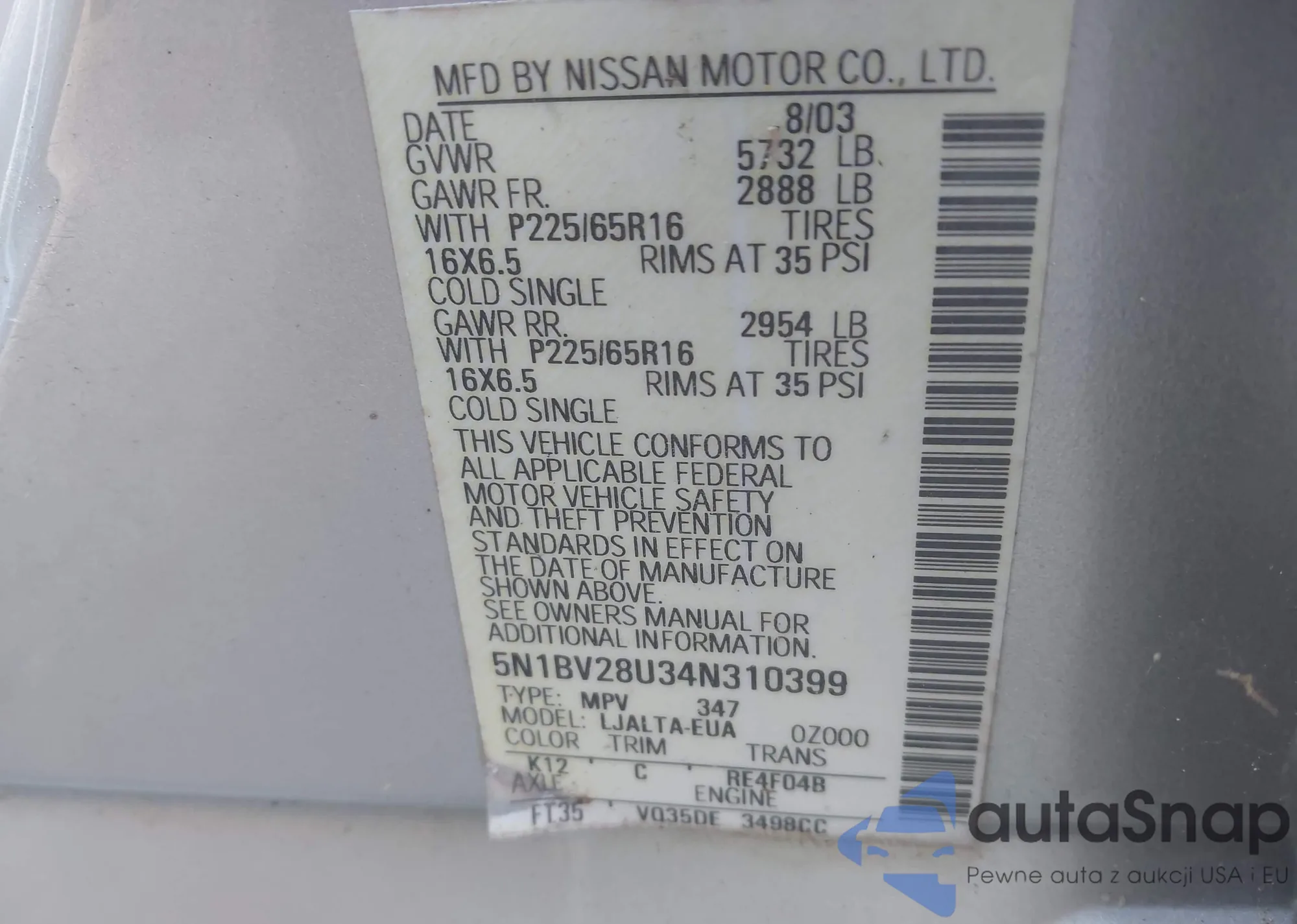 • VIN 5N1BV28U34N310399
