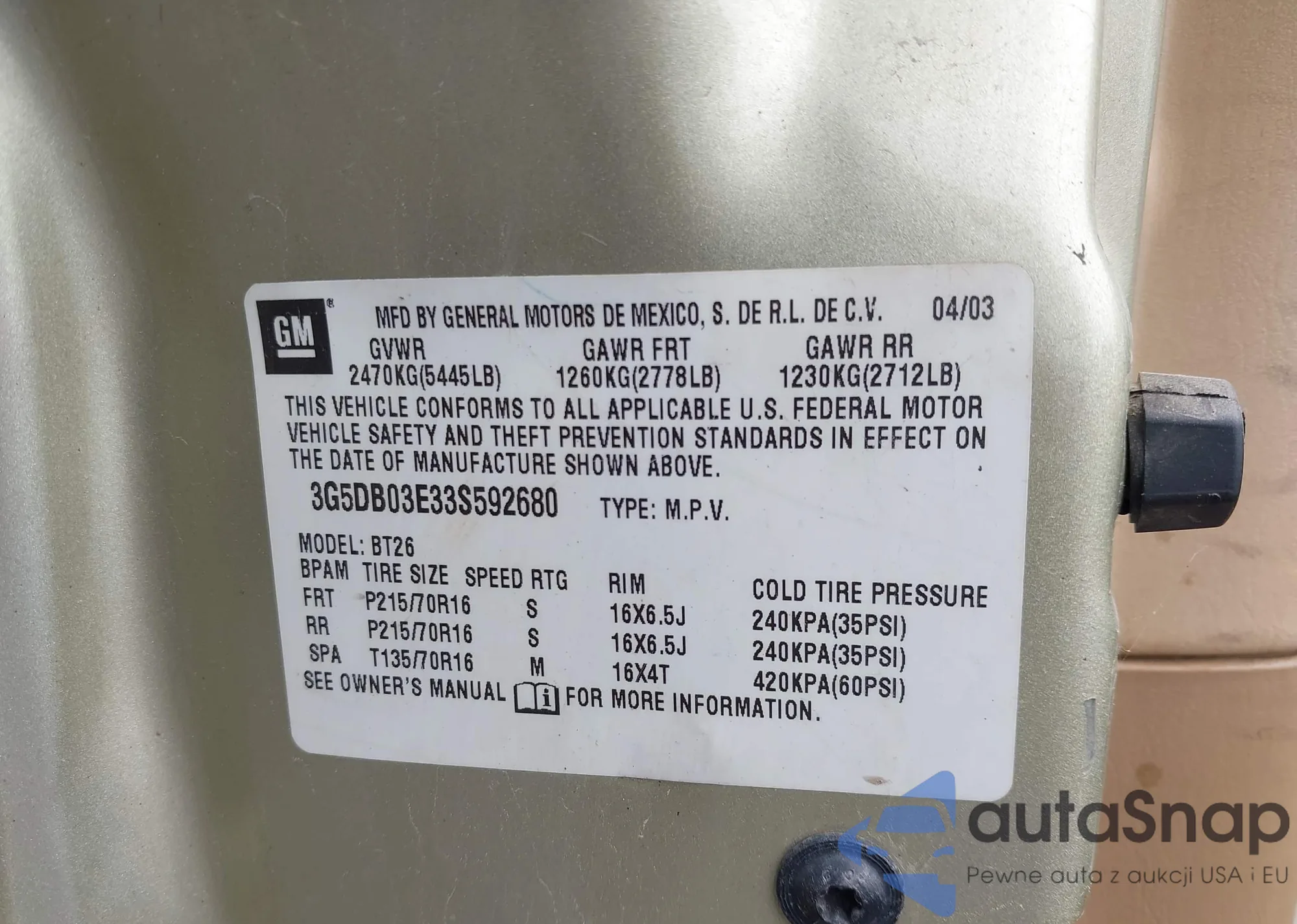 • VIN 3G5DB03E33S592680