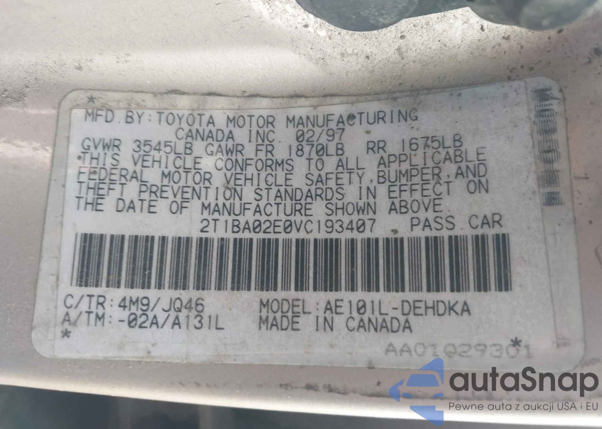 1997 Toyota Corolla Ce z USA, uszkodzony, nr VIN 2T1BA02E0VC193407