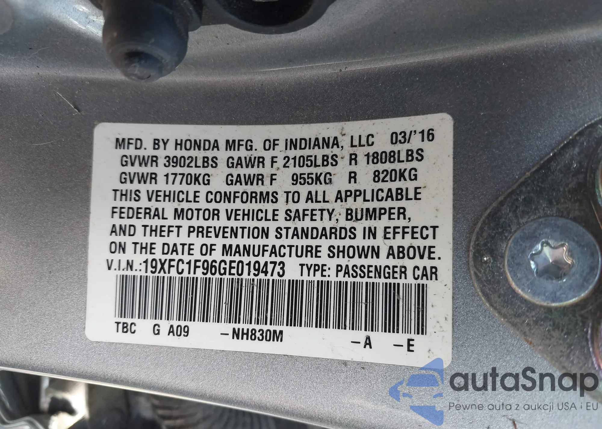• VIN 19XFC1F96GE019473