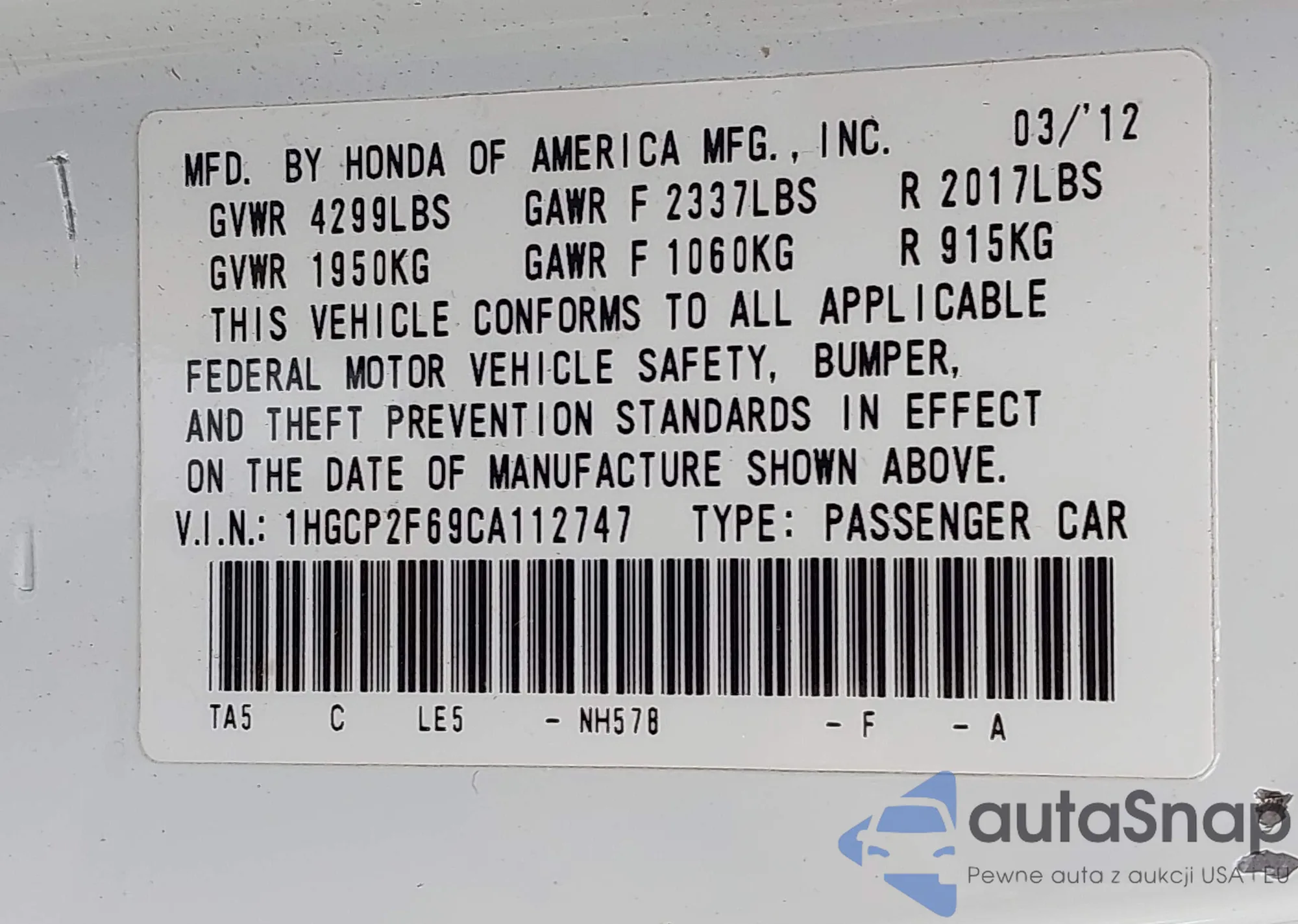 LOT: 43170973 VIN: 1HGCP2F69CA112747