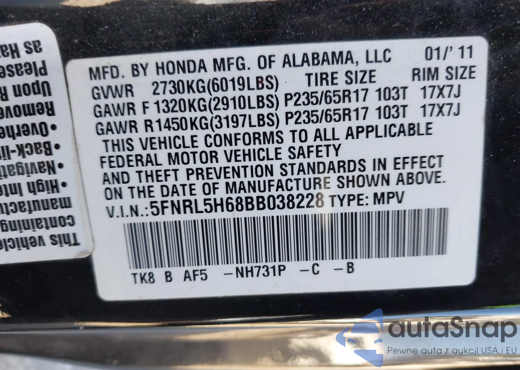 • VIN 5FNRL5H68BB038228