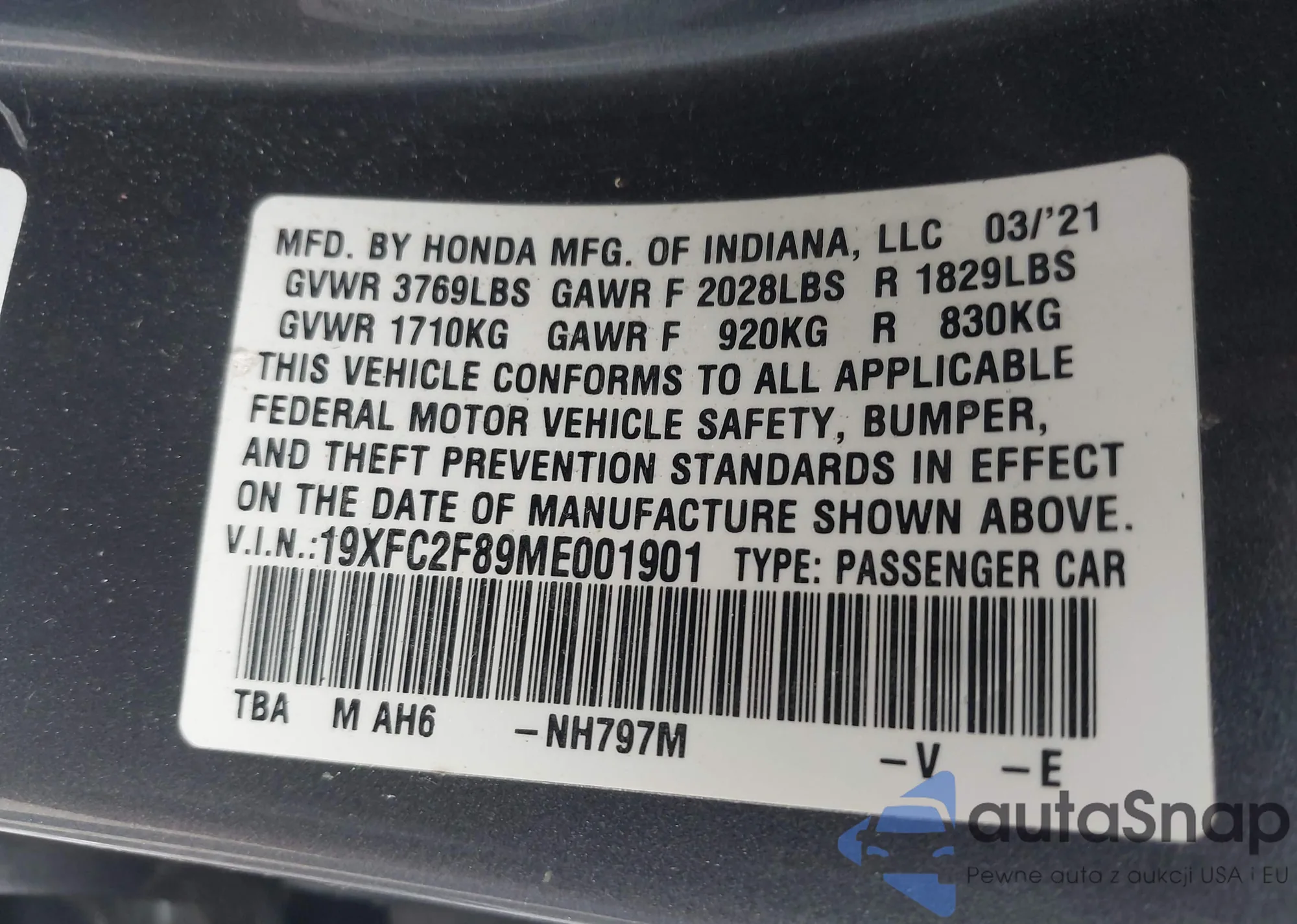 LOT: 42636040 VIN: 19XFC2F89ME001901
