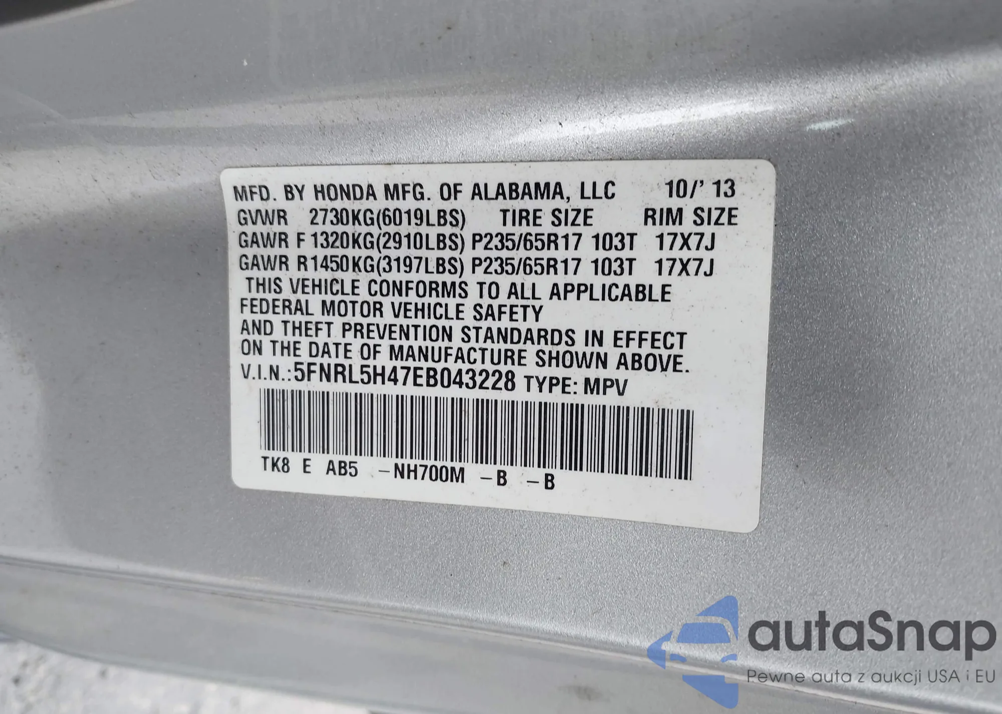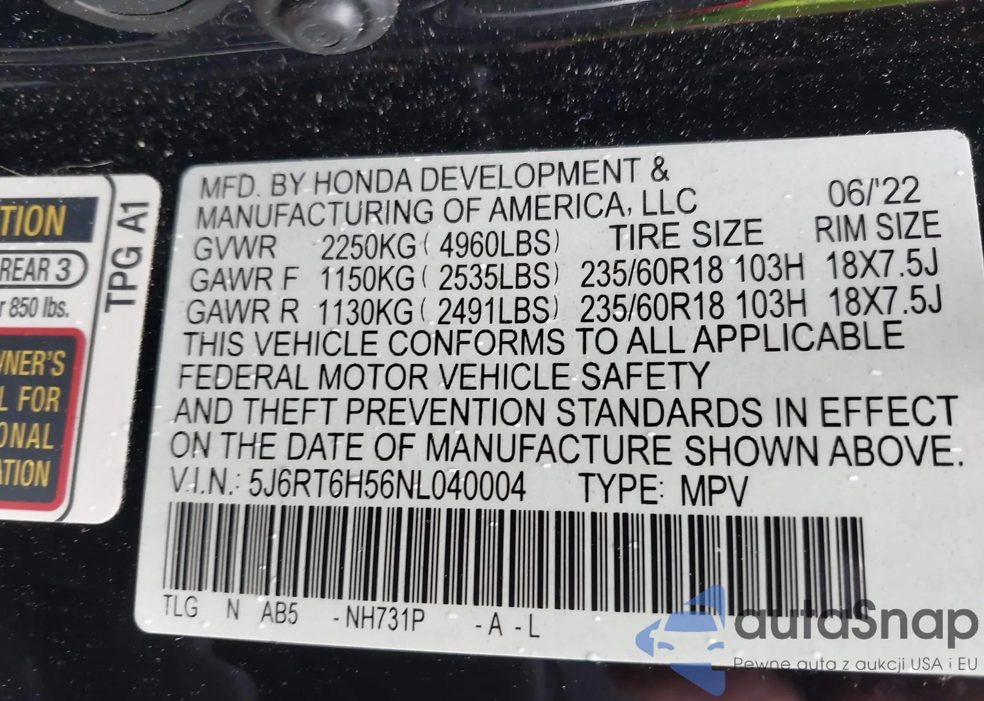 • VIN 5J6RT6H56NL040004