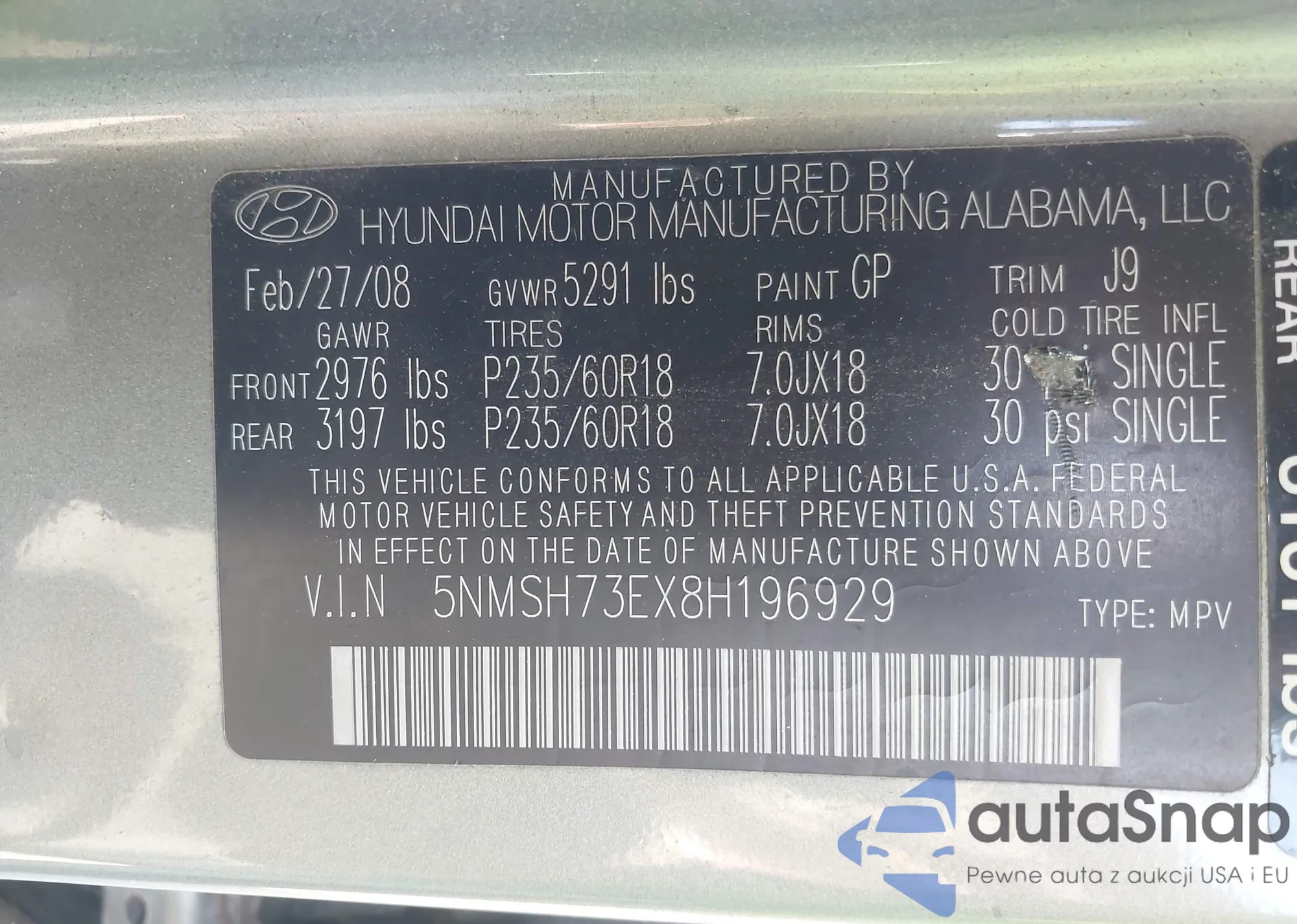 • VIN 5NMSH73EX8H196929