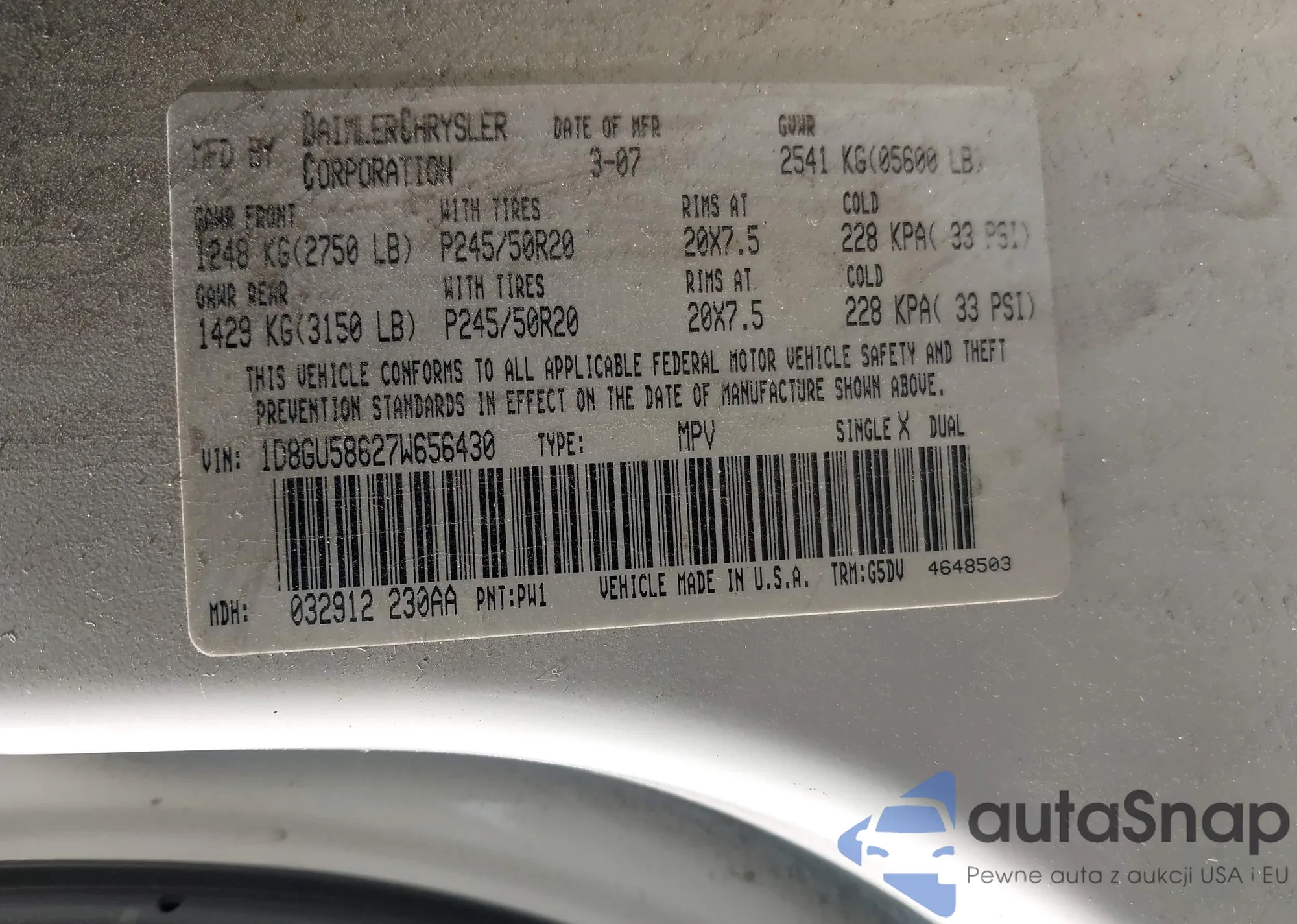• VIN 1D8GU58627W656430